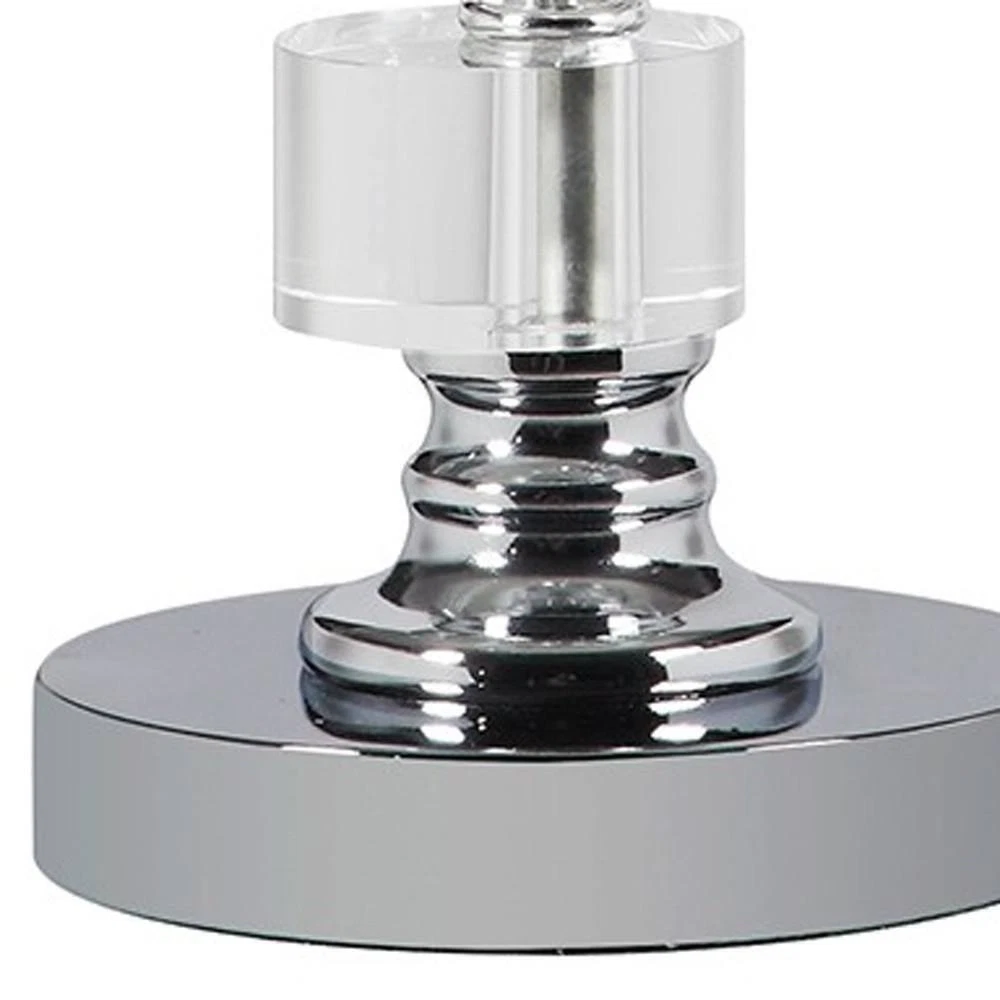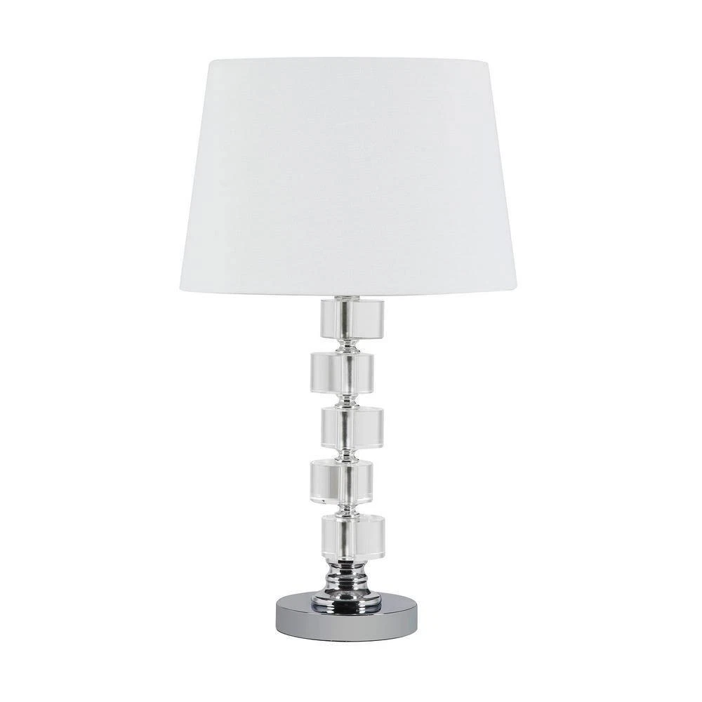 Features Base Color: Silver Base Color Family: Silver California Title 20 Compliant: No Compatible Bulb Type: CFL,Incandescent Cord Length (in.): 0.0 in Damp/Wet Rating: Dry Rated Features: No Additional Features Fixture Color/Finish: Silver Fixture Material: Metal Included: No Additional Items Included Lamp Base Material: Ceramic Lamp Design: No Design Lamp Shape: Novelty Lamp Type: Bedside Light Bulb Base Code: E26 Light Bulb Type Included: No Bulbs Included Light Setting: 1-Way (On/Off) Location Use: Bedroom Max. Bulb Wattage (W): 150 W Maximum Wattage (watts): 150 Number of Bulbs Required: 1 Number of Lights: 1 Light Power Source: Hardwired,Plug-In Product Weight (lb.): 9 lb Recommended Light Bulb Shape Code: E26 Returnable: 30-Day Shade Color Family: White Shade Fitter Type: Uno Shade Material: Linen Shade Shape: Empire Switch Mechanism: In-line Volt (v): 120 Product Depth (in.): 12 in Product Height (in.): 20 in Product Width (in.): 12 in Shade Diameter (in.): 12 in Item Description This 20 in. silver crystal stacked geo cubes table lamp with white classic empire shade is a great way to add some brightness to any corner of your home. The lamp is made of sturdy crystal and features a clear and silver coloration and geometric design that gives off an updated contemporary vibe. color. The lamp light itself is covered by a fabric, classic empire shaped shade, making this a classy piece that will complement most any interior. Bedside table lamps help to add a soft and cozy glow to your bedroom. Great for evening reading. The light that this lamp throws is soft and warm to elevate the look of most any space in your home. It is perfect for virtually any decor. 20 in. H x 12 in. W x 12 in. D.
