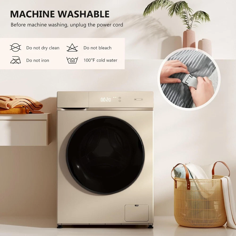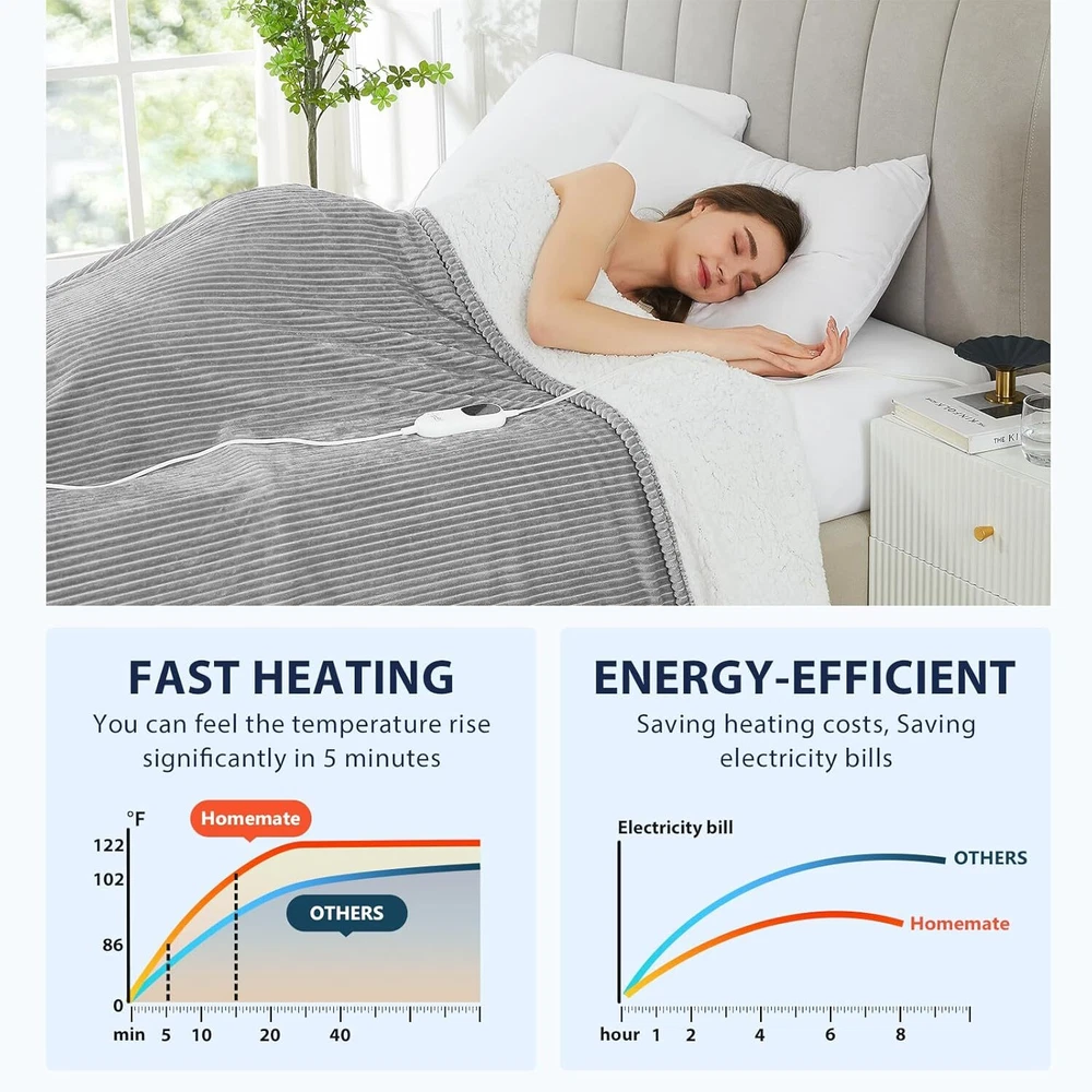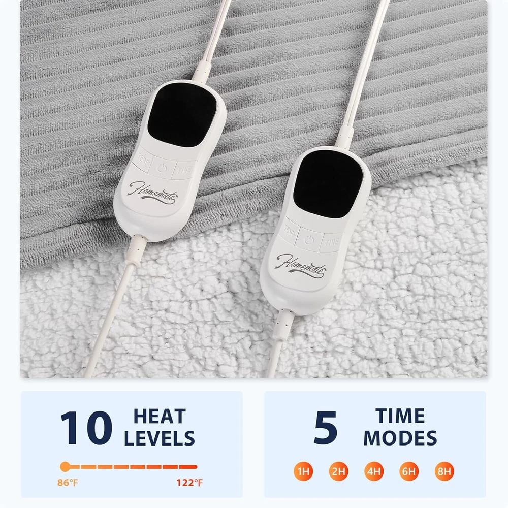 Material Sherpa Color Light Grey (Striped) Brand Homemate Special Feature Corded Style Contemporary About this item Sherpa 【Cozy Winter Nights】Provides you with a warm and cozy night's sleep in cold weather. 220gsm flannel + 200gsm sherpa.The fabric is very soft,thicker than normal blankets,and warmer than normal blankets even without electricity.The fabric is durable and does not shed. With a heating wire diameter of 2.2 mm, the presence of the heating wire is barely perceptible during use. For a more comfortable sleeping experience for comfort seekers, the electric blanket provides warmth to help them fall asleep faster. 【Safety Features】: Homemate Heated blankets have passed the American safety UL964 Test.Have ETL Certification.Lower Electro Magnetic Radiation. Moreover,the heated blanket use NTC overheating protection technology to ensure that it will not overheat and cause burning. Great for the elderly, senior citizens, pregnant women, pets, very safe and portable. 【Energy Efficiency】: Homemate heated blanket use the intelligent temperature adjustment technology. The heated blanket will automatically adjust the temperature according to the surrounding environment,which can always provide warmth and comfort to the user. Compared to air conditioning, using a Homemate heating blanket is more energy efficient and environmentally friendly, saving you more money on heating costs during the long winter months and you won't waste a lot of electricity throughout the night. 【EASY TO USE】: Homemate heated blanket queen size have 10 heat levels,1/2/4/6/8 hours auto shut off. Temperature range is 86-122°F.Very convenient to use,even the elderly,the sick,and the disabled can use it easily.Power Cord is 16.7 feet,this long cord makes the use of the blanket more flexible,can be used on the bed,on the sofa,can be used in the study and office, very convenient. 【BEST GIFT】: Homemate heating blanket queen size is the best gift for birthday or other holiday like Christmas,New Year's Day. And the use of electric blanket queen size is good for relieving muscle soreness and joint pain, it is a great gift for the elderly, patients, and people recovering from surgery. The heating wire used in the Homemate queen size electric blanket is longer, available in sizes 84x90,so the heating area is larger and the heat distribution is more uniform. The two controllers can be used independently for two people for easier use. 【5-YEAR WARRANTY】: If you encounter any quality problems within 5 years, you can contact us at any time. We have a 7x24-hour online customer service who can reply to your questions at any time. Homemate queen size heated blanket can be machine washed, but please read the instructions carequeeny before cleaning to avoid improper operation, which can avoid safety problems and prolong the service life of electric blankets. On Dec 20, 2024 at 21:57:02 PST, seller added the following information: