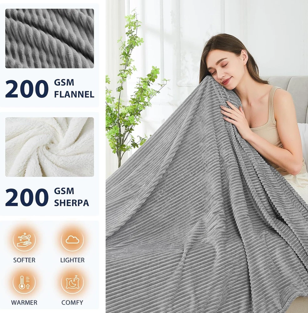 gtin13: 714243636239 Color: Light Grey (Striped) bullet point1: Sherpa Style: Contemporary UPC: 714243636239 Size: 100 Inch x 90 Inch Special Feature: Corded Model Name: Electric Blanket Number of Items: 1 Item Weight: 8.86 Fabric Type: Sherpa Material: Sherpa Blanket Form: Single Layered Blanket Fabric Warmth Description: Heavyweight Batteries required: No binding: home-garden Included Components: Controller Refill: Sherpa Age Range (Description): all ages item_weight_unit_of_measure: LB Recommended Uses For Product: Napping, Reading Brand: Homemate Type: Thermal Blanket Pattern: Bordered Manufacturer: Homemate Fill Material: Sherpa Water Resistance Level: Not Water Resistant Product Care Instructions: Machine Wash Theme: Electric Heated Blanket Seasons: Winter