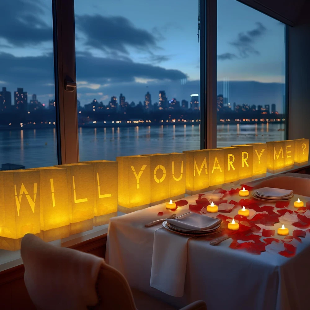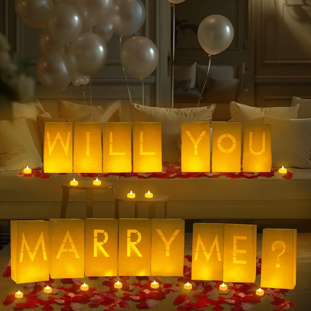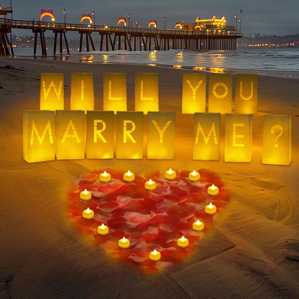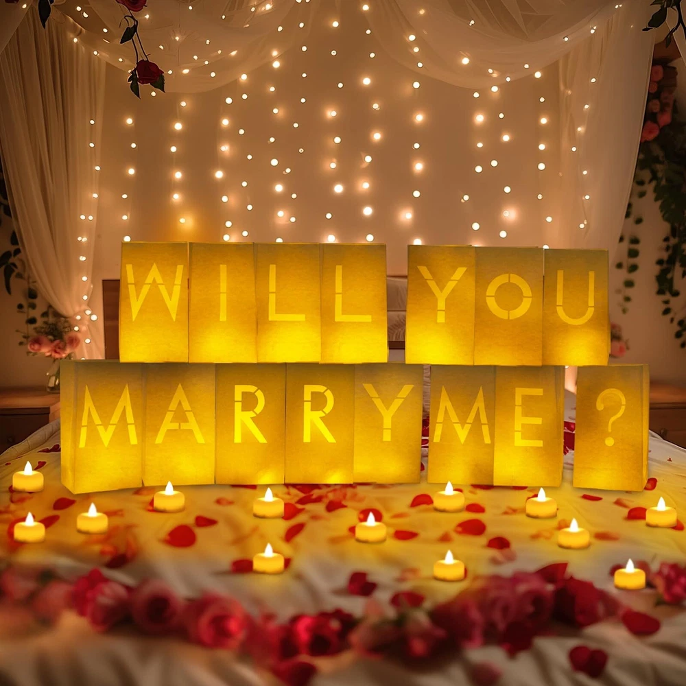 Homemory Will You Marry Me Light Up Letters Proposal Decorations with Flameless Candles and Fake Rose Petals, Valentine's Day Luminary Bags Decorations for Wedding Engagement Impressive Romantic Kit: You will get Will You Marry Me letter light up sign; 24 Pcs LED tea lights; 1000 Pcs red fake rose petals and 1000 Pcs pink fake rose petals. Creating a warm atmosphere for this important day Easy to Use: Simply place the candles inside each luminary bag, and the light shines through the bag to illuminate the letters. For outdoor use you can put some rocks or sand at the bottom of each bag so they don't get blown over by the wind Romantic Decoration: These paper bags can create a romantic atmosphere in a dark place. The tealights are bright and soft, creating a warm and inviting glow. Sprinkle with romantic rose petals and they are sure to impress your lover Surprise Decoration: Choose a special occasion to create unforgettable memories for your loved ones. The light up letters with LED tea lights and rose petals are a fantastic addition to any romantic celebration Wide Application: Our candle luminary bag decoration kit is suitable for various places - whether it's your living room, the comfort of a hotel, the waterfront, or the bedroom. Brighten up your party decor with this romantic kit which guarantees glamour and elegance Shipping We offer FREE shipping on all orders! We ship within Three business days of payment, usually sooner. We use a selection of shipping services such as UPS, FedEx, USPS etc. We only ship to the lower 48 states, no APO/FPO addresses or PO Boxes allowed. Local pickups and combined shipping options are not provided at this time. Return You can return a product for up to 30 days from the date you purchased it. Any product you return must be in the same condition you received it and in the original packaging. Please keep the receipt. Feedback Customer satisfaction is very important to us. If you have any problem with your order, please contact us and we will do our best to make you satisfied. Contact Us If you have any queries, please contact us via ebay. We usually respond within 24 hours on weekdays. Please visit our eBay store to check out other items for sale! Thank you for shopping at our store.