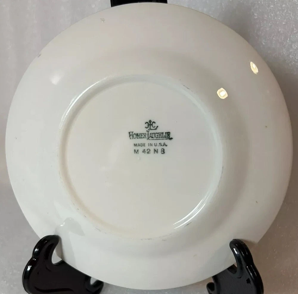 This vintage 1942 Homer Laughlin salad or bread plate is a beautiful replacement for your chipped or broken one. Made of high-quality porcelain with a glossy finish, it features two thin gold stripes. Measuring 6 inches in diameter and .5 inches in height, it is in wonderful condition. Please see photos for details. Please let me know if you have any questions. I use recycled materials in shipping whenever possible. **Plate holder is not included **