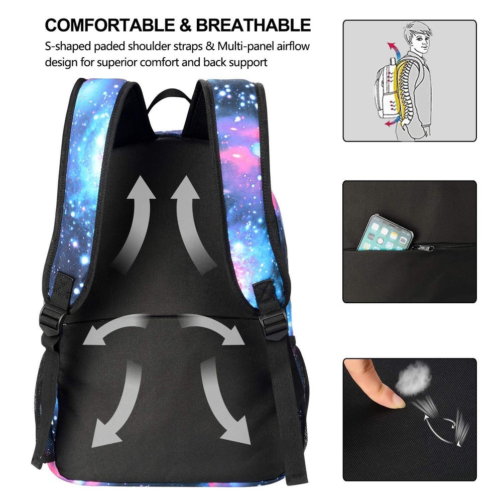Features: External Charging: An external USB port provides a more convenient and easier way to charge your phone. Please noted that power bank is not included. The cool backpack has padded adjustable straps and padded back that make it comfortable to carry. Large capacity: Backpack size is 18.9*11.4*6.7 Inches; You can put laptop, books, magazines, power bank, clothes, iPad, pencil, keys, coins, cards,wallet,earphones,water bottle, cups, umbrella,etc. This school bag is made of waterproof Oxford Textile and heavy-duty inner lining, you can take it in a rainy day! The materials is durable and easy to clean, machine washable, anti-scratch for extra security and long-lasting protection. Free Combination lock work with durable metal zippers close and open smoothly to keep your stuff inside the backpack safe while commuting. Free Pencil Case: The pencil bag is big enough for pencils, keys and other small school essentials. Suitable for a variety of Situations: Suitable for all school bookbag, book bags, student backpack, collage backpack, high school backpack, middle school backpack and suitable for teen boys backpack, teen girls backpack, kids backpack, hiking backpack, camping backpack, climbing backpack, traveling backpack, cycling backpack casual backpack, usb backpack, water resistant backpack, laptop backpack or outdoor activities backpack Washing Instructions: DO NOT washing with hot water. Washing separately to avoid staining. Washing with clean water with ordinary temperatures. Package Included: 1x Backpack 1x Pencil Bag 1x Password Lock 1x USB Cable FASHION LUMINOUS BACKPACK: The best part of this stylish cool backpack is after absorbing light in the day about 10-20 minutes, you can see the fluorescent effect in the dark and can keep about 4-6 hours. Makes you safer when jogging, walking and cycling at night. ANTI THEFT BACKPACK: Theft proof combination lock and dual-access zipper to keep your belongings safe, say goodbye to those pickpocket behind you. Purchasing this anime backpack, you will get 1pcs password lock +1pcs luminous pencil case + 1pcs USB cable by free. USB PORT DESIGN: With built in USB charger outside and built in charging cable inside, this school backpack with usb charging port offers you a more convenient way to charge your phone while walking. Please noted that this backpack doesn't power itself, usb charging port only offers an easy access to charge. LARGE CAPACITY & LIGHTWEIGHT: 18.9*11.4*6.7 Inches, fits laptop up to 15.4". Multiple divider pockets to hold laptop,cellphone, iPad, power bank, pen, keys, wallet, books, snacks, clothes, umbrella, water bottles, and more.This water resistant backpack is made of durable eco-friendly Oxford fabric with good breathability, ergonomic design of shoulder strap and scientific reasonable weight-bearing design. Luminous bookbag is suitable for kids, girls and boys back to school, travel, hiking, camping, cycling, shopping, dating, birthdays, Christmas day and etc. Recommended Age Grading: Over 6 years old.