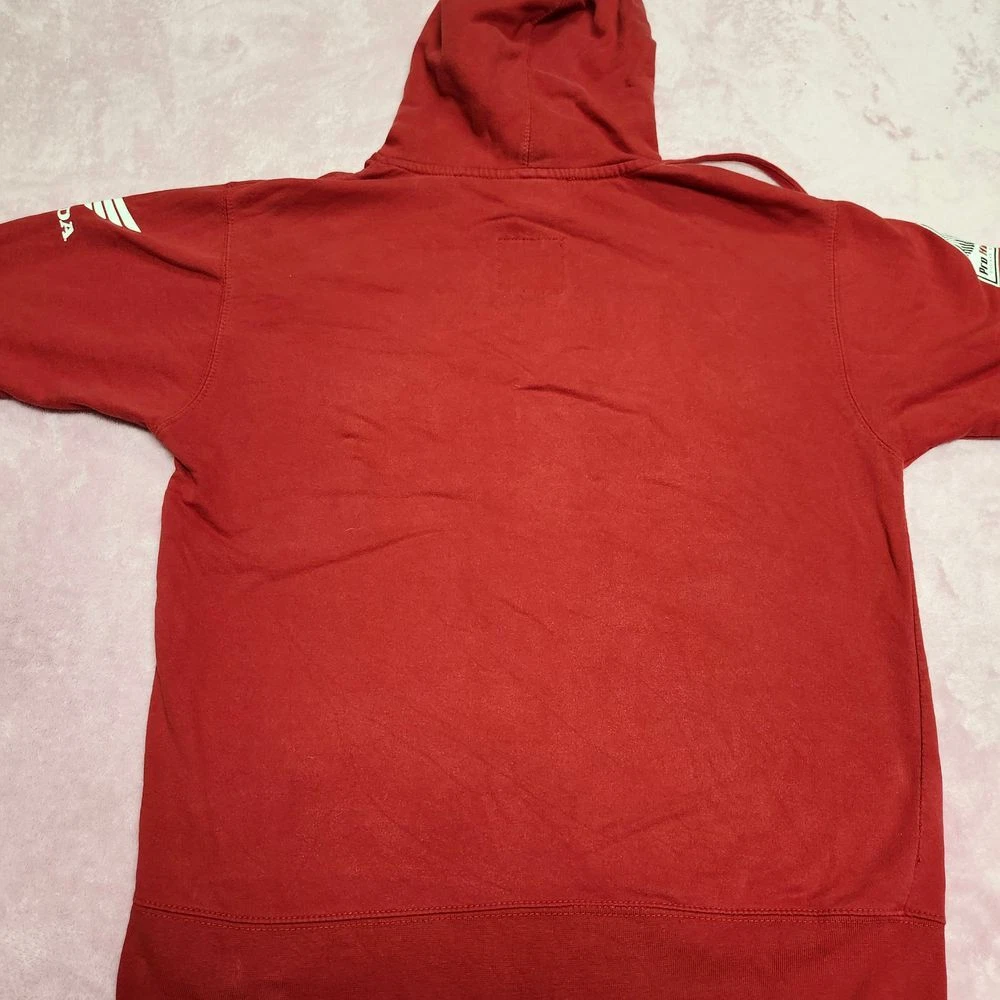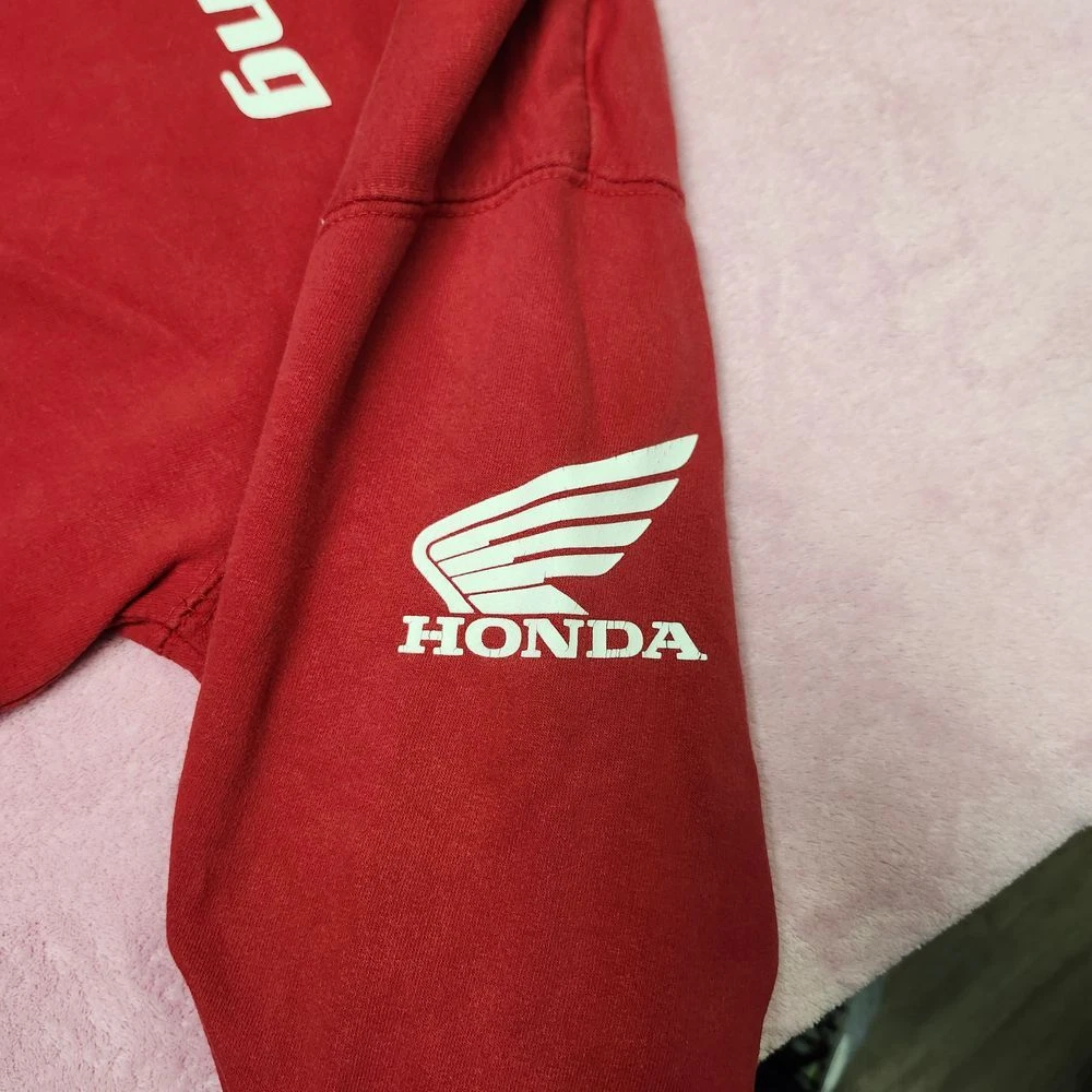 Authentic Honda Racing hoodie featuring bold Pro Circuit FX branding and iconic Honda wing logo. Perfect for motorsport enthusiasts and racing fans. This classic red pullover combines comfort with racing heritage style. Ideal for race day events, casual wear, or showing your passion for Honda motorsports. Features front kangaroo pocket and adjustable drawstring hood. Type: Hoodie Color: Red Department: Men Style: Pullover Features: Hooded, Adjustable, Lightweight Closure: Drawstring Fabric Type: Fleece Performance/Activity: Racing Pattern: Graphic Print Accents: Logo Material: Cotton Blend Keywords: honda racing, pro circuit, motorsport, racing hoodie, pullover, motorcycle, racing apparel, honda wing, fx racing, vintage racing, automotive, streetwear