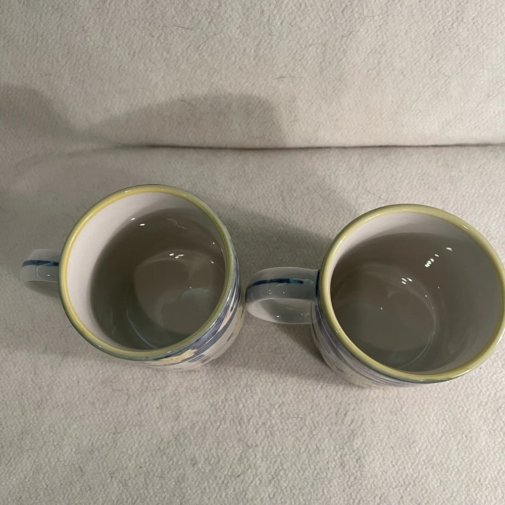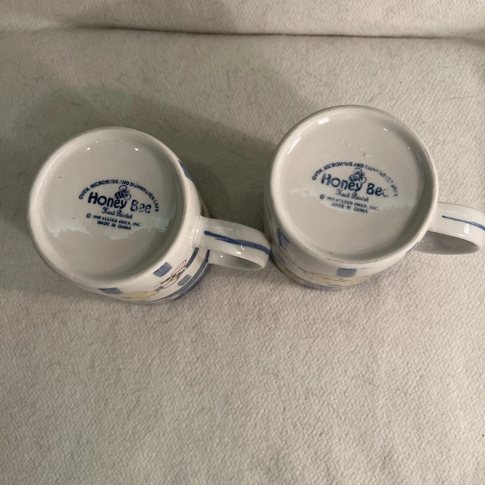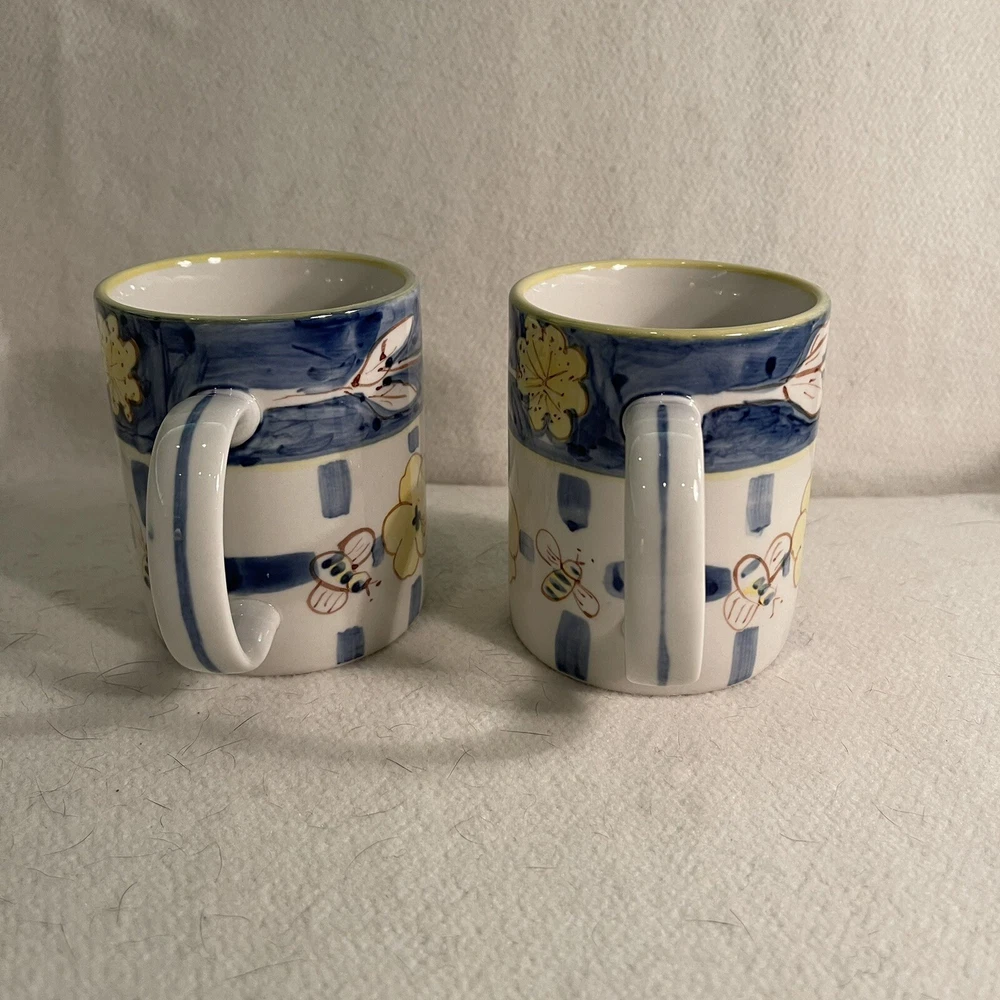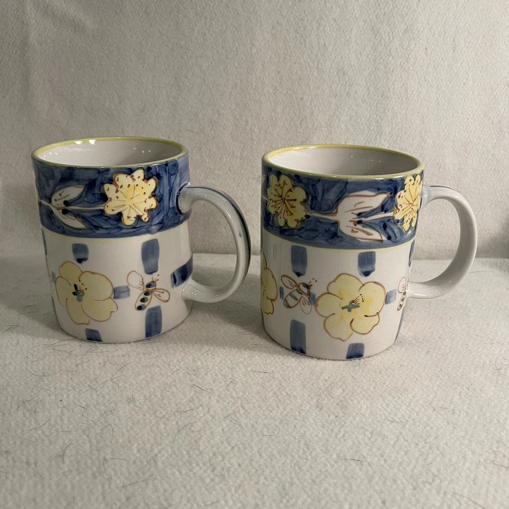 This charming set of two ceramic mugs features a delightful bee flower pattern in shades of yellow and blue. The round shape and contemporary style make them perfect for any coffee or tea lover's collection. These mugs are vintage, manufactured in the 1990s, and weigh a total of 1.1 lbs. The brand is Honey Bee and the item height is 3.75", while the item width is 3.25". These mugs are made of both ceramic and porcelain materials, making them durable and long-lasting. They are perfect for collectors or anyone who loves the bee flower theme. Excellent condition. No chips or cracks.
