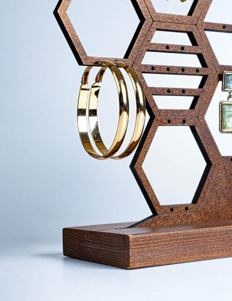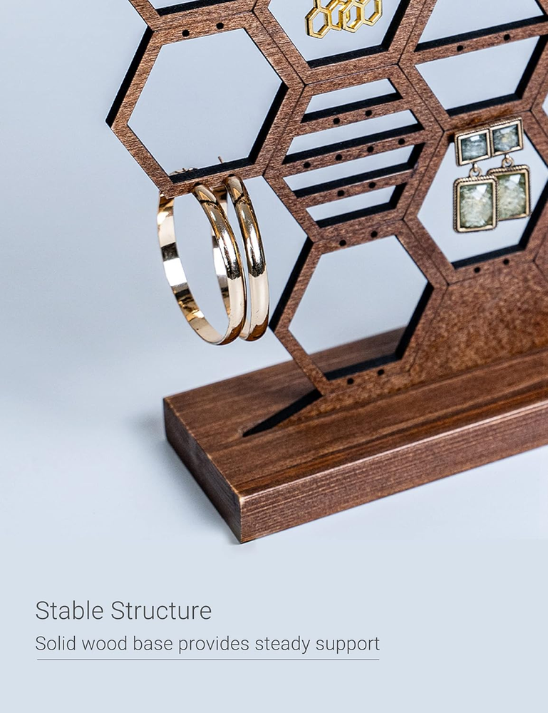 Capacious Earring Organizer & Display - Organizes at least 65 pairs of earrings with 130 holes. It's a great way to display your earrings and helps you choosing different pieces to wear much easier. Stable Structure - Product including a honeycomb design organizer frame and a solid base stand. The size of the frame is 15.7"x 0.19"x 9.2" and the size of the stand is 14.2"x 2.6"x 0.6". Total weight is 297g. Easily installation, just to insert the organizer frame into the base stand. Stylish Honeycomb Design - The design of the organizer allows for dangling earrings, hook earrings, stud earrings and hoop earrings, which make it very versatile. Elegant Room Decoration - The walnut wood earring organizer stand looks like a piece of artwork. It's an elegant decoration to the table and perfectly matches your bedroom or living room. Perfect for Gift - The product comes with a beautiful gift box. It can be the perfect gift for girls and women who wearing earrings. Product Description Package content : 1 x Honeycomb organizer frame 1 x Solid wood base stand 1 x Gift box Size: 14.2"x 2.6"x 0.6" Weight: 297g Color: walnut wood Material: wood Shape: Honeycomb Heesch Honeycomb Earring Holder Stand Capacious Earring Organizer & Display Organizes at least 65 pairs of earrings with 130 holes. It's a great way to display your earrings and helps you choosing different pieces to wear much easier. The design of the organizer allows for dangling earrings, hook earrings, stud earrings and hoop earrings, which make it very versatile. The walnut wood earring organizer stand looks like a piece of artwork. It's an elegant decoration to the table and perfectly matches your bedroom or living room. Spacious earring organization Stylish beehive design Beautiful room decoration Easy installation Perfect as a gift Product Details Stable Structure Solid wood base stand provides steady support. Easy to Assemble Product including a honeycomb design organizer frame and a solid base stand. Just to insert the organizer frame into the base stand. Perfect for Gift The product comes with a beautiful gift box. It can be the perfect gift for girls and women who wearing earrings. The design of the organizer allows for all kinds of earrings Stud Earrings Dangling Earrings Hoop Earrings