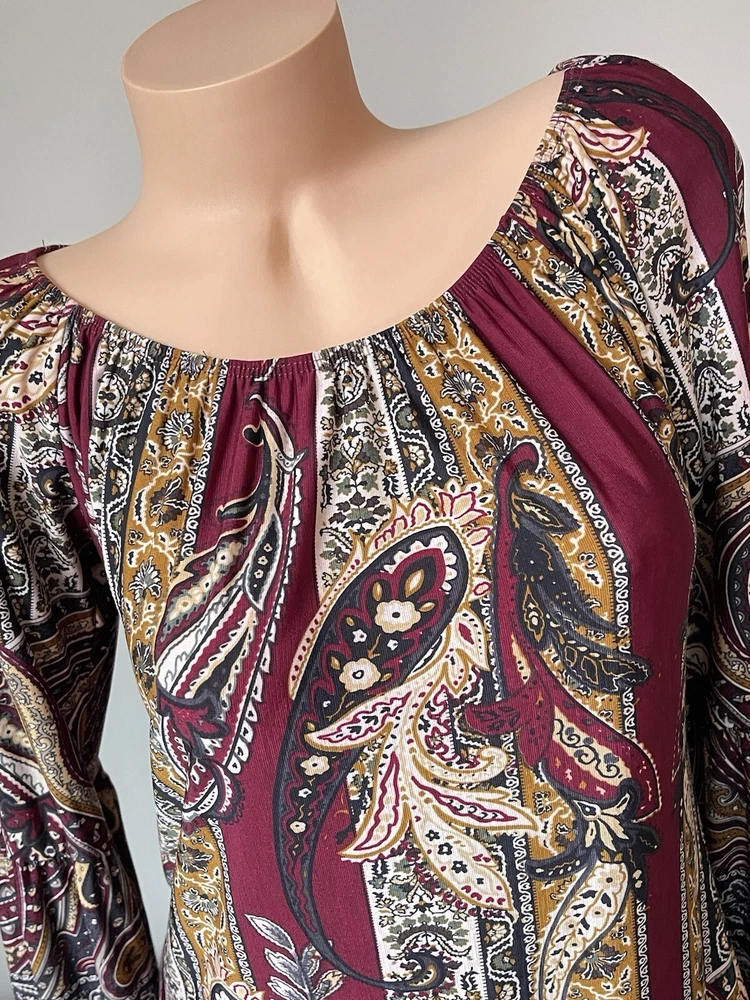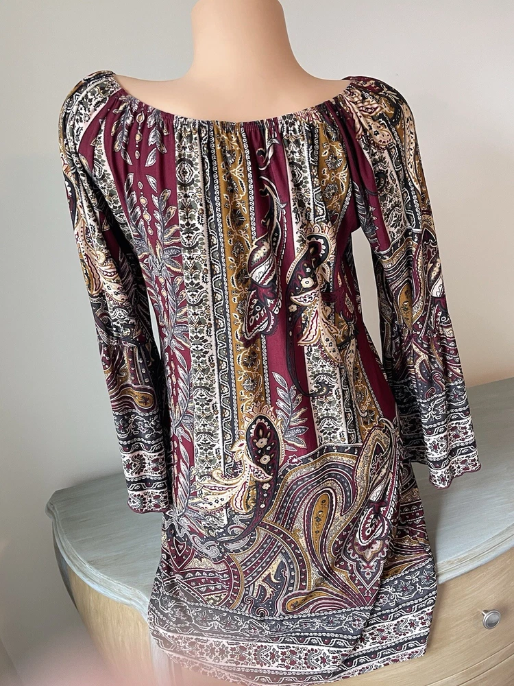 Tattoo, Teacher, Tribal, Autumn Fall Color Pallet, Everyday Weekend Versatile Traveler, Art hoe to wear artsy fartsy artisan indie abstract artistic, Beach town streetwear beachy summer summery sun sunshine, Boho bohemian gypsy gypsie hippie hippy hippey fairy, Indie, Classy classic core timeless staple piece traditional, College Back To School, Colorful bold bright vivid loud fun lively dopamine poppin, Free returns combined shipping, Lightning fast shipping ship shipment same or next day, Pullover popover pop over pull over, Stretch Comfort Comfy feels Everyday Anywear wearable practical, Badi, Basic simple minimalist modest practical comfortable, Wrinkle free resistant non no iron easy care, Whimsy whimsical boutique, Soft girl aesthetic feminine sweet girly adorable cute, Med Medium, Off The Shoulder, Fall Pallet Autumn Bell Flare Sleeve, Brown Maroon Burgundy Gold Orange Yellow, Weekend wear daywear lounge fashion easy, City Flower Paris Peasant Retro