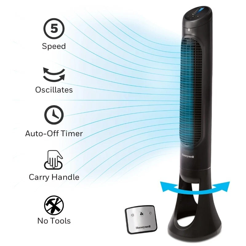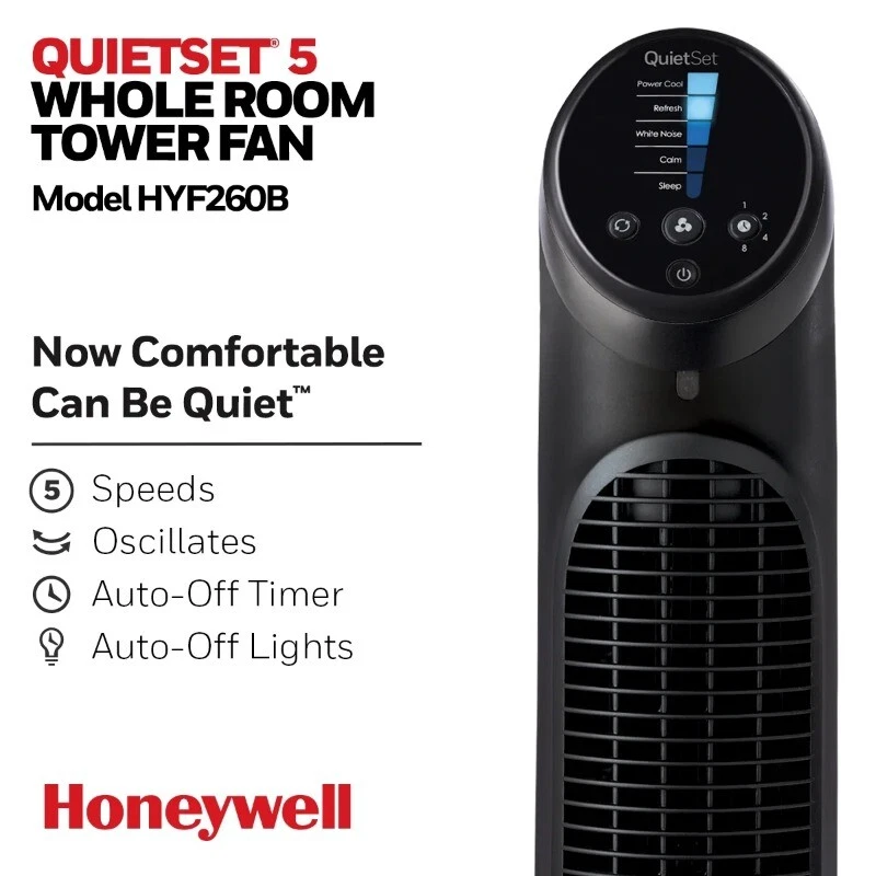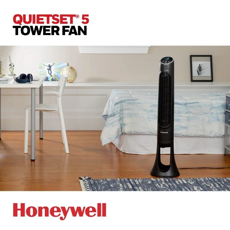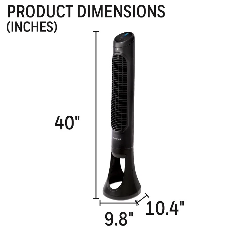 Enjoy a cool breeze in every room with the Honeywell 40" Quiet Set Tower Fan. It features five speeds that are customizable and range from sleep to power cool settings. The lights on the control panel automatically dim after 15 seconds, making it ideal for nighttime use as well. This slim tower fan has touch-button electronic controls that are easy to use and a remote-control nest. The slim design of this unit is convenient because it does not take up too much space in your home. The oscillating tower fan has a sturdy and durable base that is to easy setup, requiring no tools. 5-speed setting, customizable and range from sleep to power cool settings Powerful, quiet whole room cooling Remote control makes it convenient to control the unit from a distance Oscillation evenly cools the entire room Electric tower fan has a sturdy base Easy set up and no tools assembly Remote control nest for safe storage Auto-dim lights reduce to 50% brightness after 15 seconds ideal for nighttime use, interaction brings lights back on at 100% 1, 2, 4 and 8 hour auto shut-off timer and touch button electronic controls