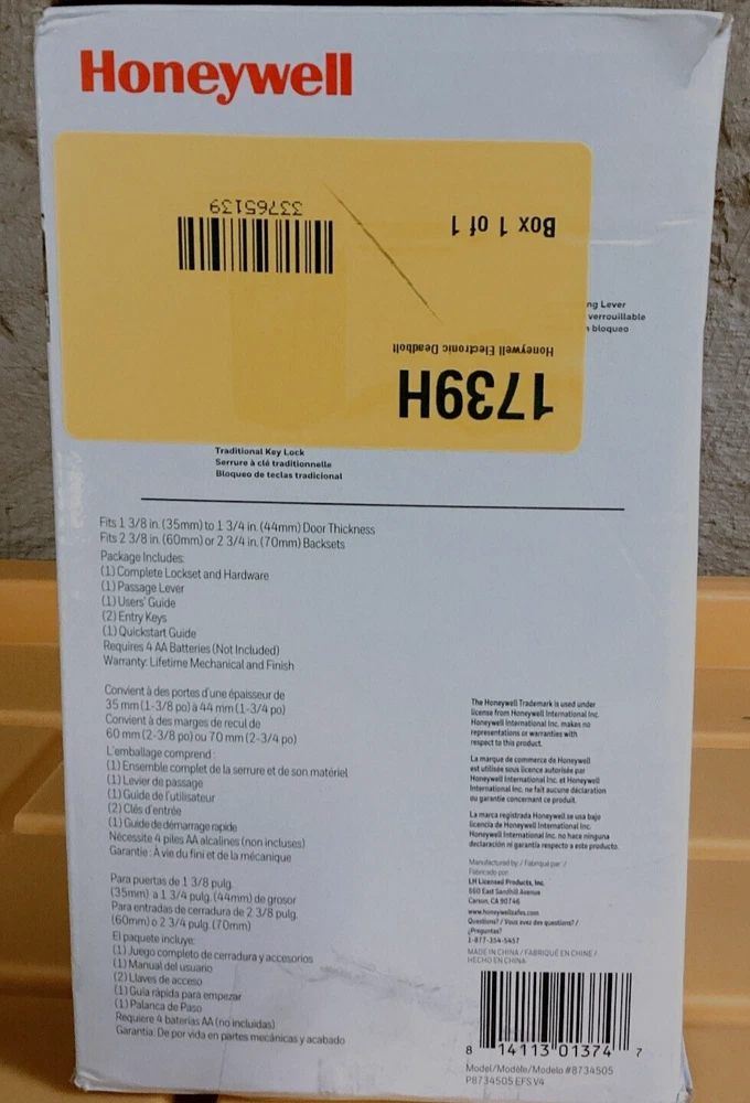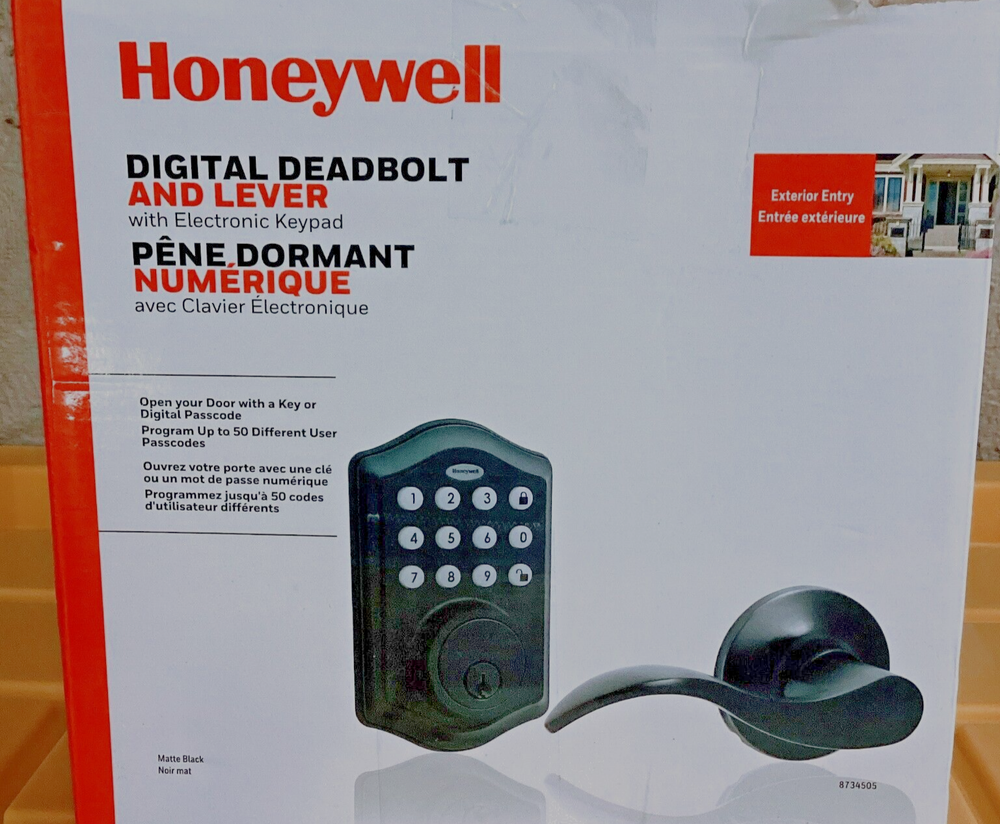 The Honeywell Electronic Entry Deadbolt with Passage Lever Combo features a convenient one-touch locking system with 50 programmable user codes. Security is enhanced with the inclusion of an alarm that will sound after four incorrect attempts at entering the code. Available in a matte black finish, this electronic entry deadbolt with lever combo is suitable for a wide range of doors and home decor styles. Installation can be accomplished within minutes. Simply use a Philips screwdriver when holes are predrilled into the door. This electronic entry deadbolt requires 4 AA batteries (not included) to operate. The Honeywell Digital Deadbolt with Lever Combo fits 1 3/8 to 1 3/4 in. door thickness with an adjustable latch that fits 2 3/8 in. or 2 3/4 in. backsets. The Honeywell Digital Deadbolt with Passage Lever includes the following: adjustable latches, mounting kit, instructions and drilling templates.