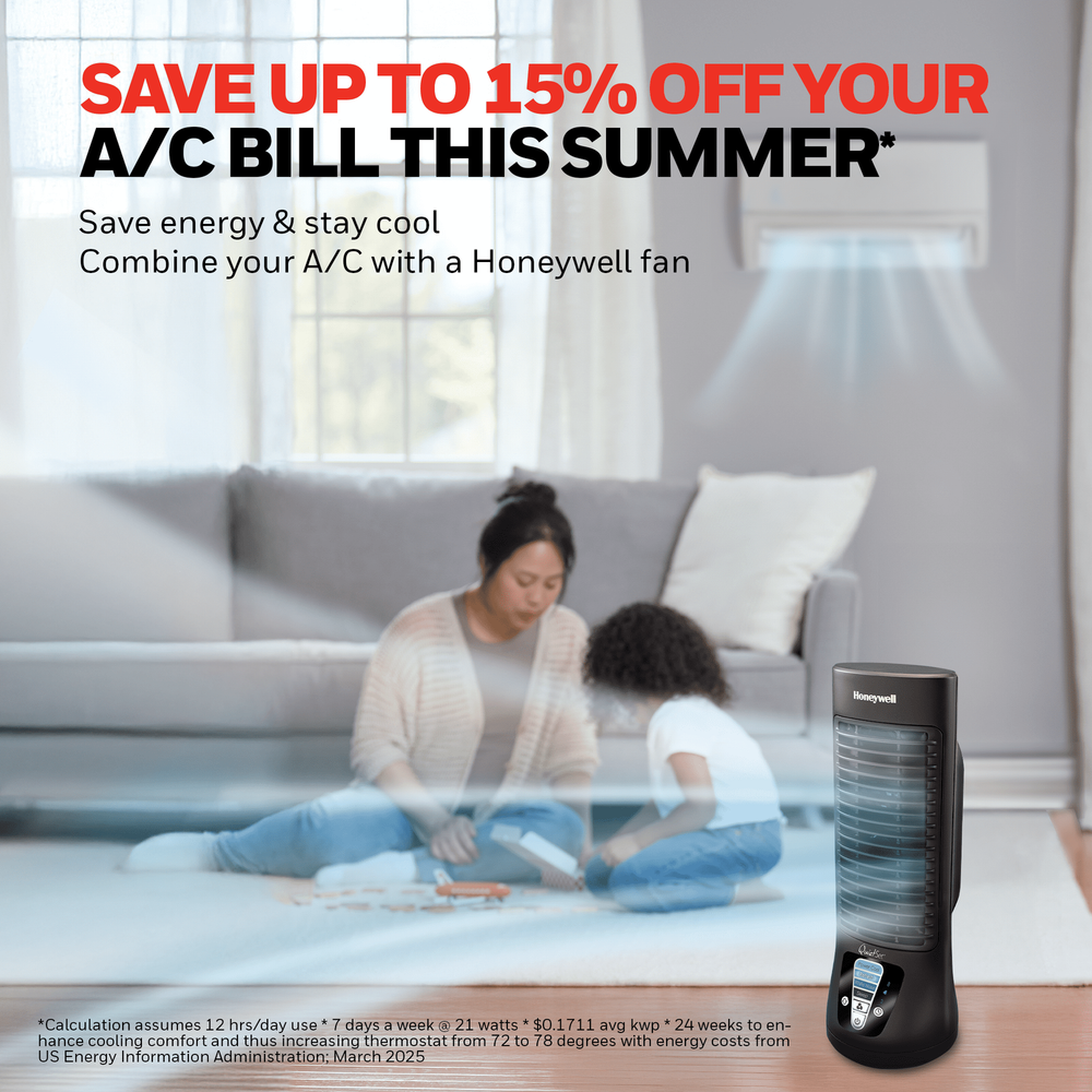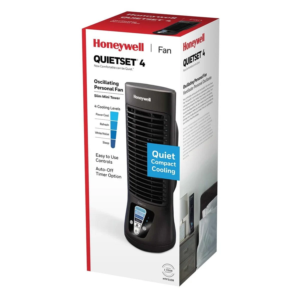 Customize your cooling and stay comfortable with the Honeywell QuietSet Personal Table Fan. This 13” mini tower fan has a slim, compact design and oscillates to provides powerful cooling with quiet operation. Choose what’s best for your environment with 4 levels of sound and power settings. Ideal for personal cooling for desktops, nightstands and more, the quiet tower fan features a 4 levels of sound/power and an automatic shut off timer. Customize your cooling to however you like it with this portable indoor fan. A house fan is an easy way to cool down any space and improve airflow. Give your air conditioner a break by using a portable indoor fan to help reduce your energy consumption and costs.* *Save up to 20% on energy bills when used with an air conditioner. Save up to 5% for each degree you raise the thermostat. Raise temperature up to 4 degrees without sacrificing comfort. Increased air flow allows the a/c to be used at lower wattage settings to help save you money. OSCILLATING TABLE FAN – The New Honeywell QuietSet 13” Personal Table Fan provides powerful personal cooling with quiet operation and a slim, compact design. Choose what’s best for your environment with 4 levels of sound and power settings in one small fan QUIET COOLING – Not just a personal fan, this oscillating tower fan offers powerful cooling with less sound. It features a compact size, quiet operation, oscillation, automatic shut-off timer and 4 levels of sound/power, so you’re always comfortable. CUSTOMIZE YOUR COMFORT – With multiple options for sound and power, you’ll always be cool. This compact fan is great as a fan for a bedroom, on nightstands, desks and more. Customize your cooling to however you like it with this quiet fan SMART SAVINGS – Fans for home are an easy way to cool down any space and improve airflow. Give your air conditioner a break by using a portable indoor fan to help reduce your energy consumption and costs.* HONEYWELL QUALITY – Help improve cooling and energy savings* anywhere in your home like the living room, bedroom or office using a Honeywell fan. We offer personal fans, whole room fans, tower fans and oscillating fans that are a great choice.