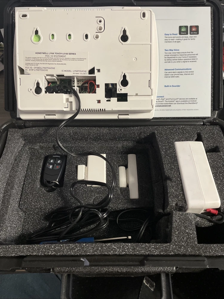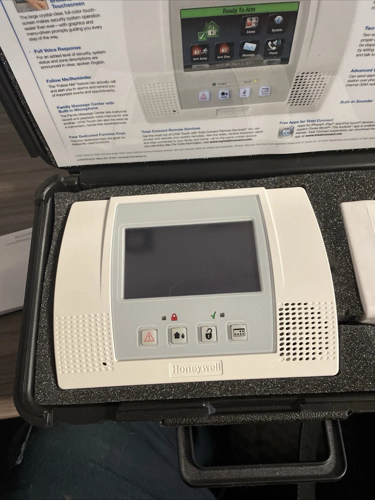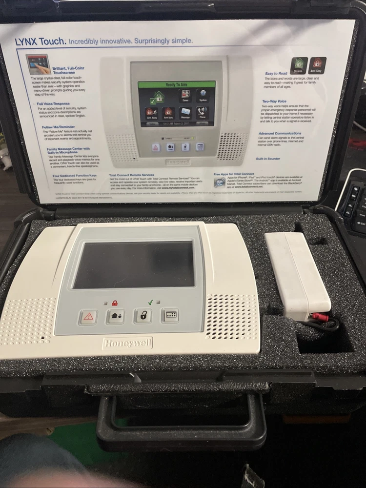 Honeywell Lynx Touch Security System L5100 Model LYNXTOUCH2 comes in a demo case. It is a white control panel with a touchscreen interface. This wireless system includes an alarm, has 64 zones, and operates on a hardwired power source. It is designed for indoor use and features an 85db operating sound rating.