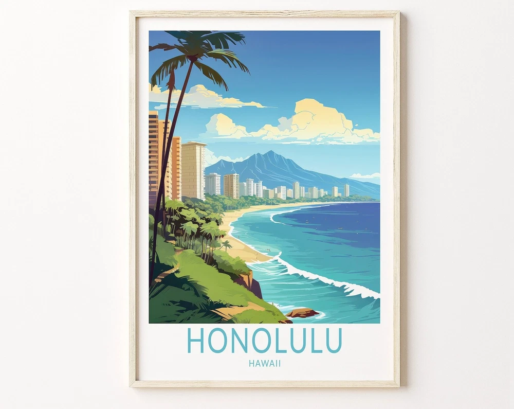 Honolulu Hawaii Travel Print Hawaii Travel Art Wall Decor Honolulu Hawaii Home Decor Wall Art City Travel Poster Gifts Home Decor Material: Premium luster photo paper Print type: Inkjet printing One side printed + The finish provides the highest possible resolution and color saturation + Lasts up to 200 years in color and 400 years in black-and-white + Printed on high-quality resin-coated photo base paper medium + Posters can be hung with double-sided tape, tacks, or framed + Hand washing with a gentle cry cloth is recommended for extended durability I will hand select the best choice of paper for your chosen design to ensure top quality results for a beautiful, bright and luxurious print. All prints are sealed in cellophane slips for protection during transportation, and are shipped in a protective cardboard envelope.