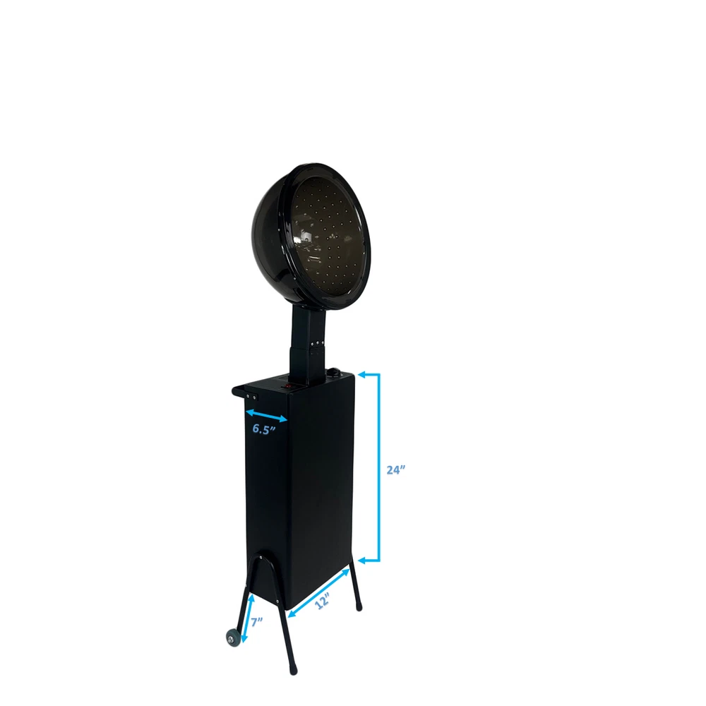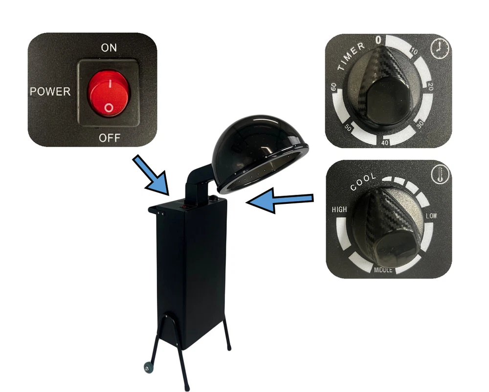 CE Certified 1200-Watt Professional Salon Hooded Hair Dryer with Wheel Kit CE Certified - International compliance to safety standards 1200 watt heating power 60-minute adjustable auto-shutoff timer Heat up to 165° F Includes free optional rolling wheel kit Item Description This 1200 watt extra hot hooded hair dryer can serve all your salon conditioning hair dryer or permanent wave needs. The quiet operation dryer has a 60-minute auto-shutoff timer and the temperature can be adjusted up to 165° F. This is a downdraft hair dryer, so hair nets are not mandatory for the drying process. Fit this industry-standard sized hair dryer in your existing dryer chair, or utilize the included FREE Wheel & Handle Kit (a $35 value) to roll the dryer around and use it independently with existing styling or waiting room chairs. The smoke-gray hood has a 12" diameter and can be raised an additional 10" for taller clients. Dimensions: 12"W x 6.5"D x 24"H - (wheel kit addes 7" to height) eBay Store See our entire eBay store Bookmark Us Save our store for quick and easy shopping Contact Us Contact us if you have any questions