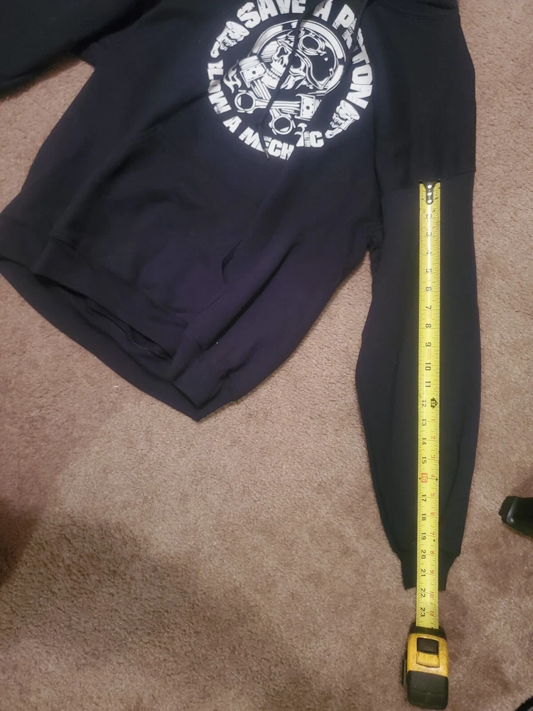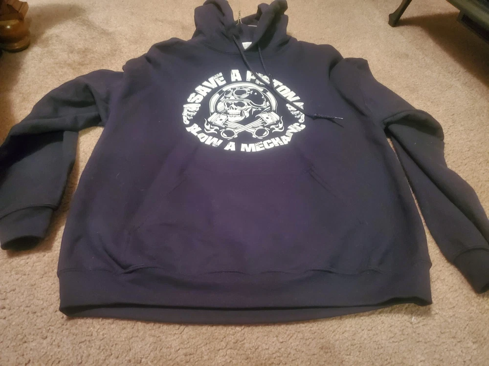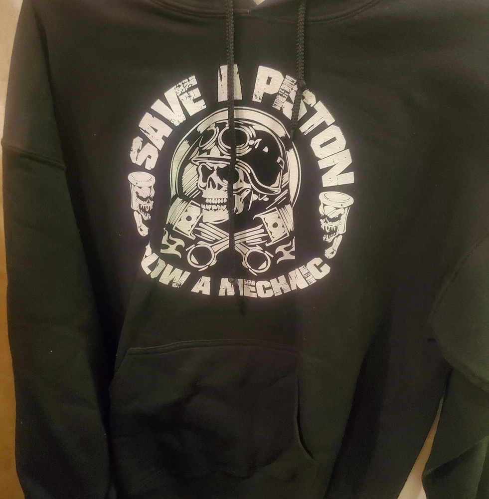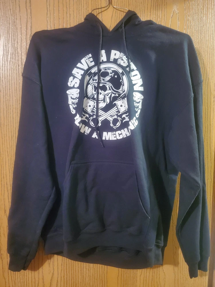 This black hooded sweatshirt is perfect for any mechanic or auto enthusiast. With a fun and unique design featuring a skull and the words "Save a Piston" on the front, this Gildan Heavy Blend hoodie is sure to turn heads. Made of a comfortable blend of polyester and cotton, it is machine washable for easy care. Any questions please message. Tried to attach as many photos as possible. Thank you! The long sleeve hoodie comes in a size L and is unisex, making it a great addition to any wardrobe. It also features convenient pockets for added functionality. Made in Honduras, this Gildan brand hoodie is part of the Activewear category and is perfect for anyone looking for a comfortable and stylish piece of clothing. This item is as is. Sold as is.