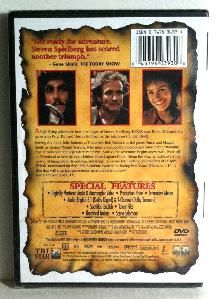Hook (DVD, 1991) Robin Williams, Dustin Hoffman, Julia Roberts, NEW Sealed