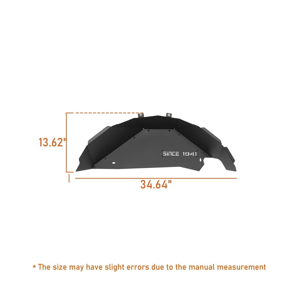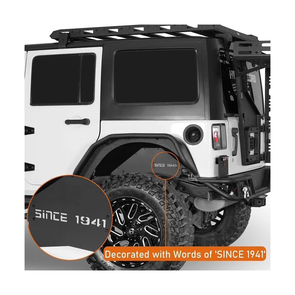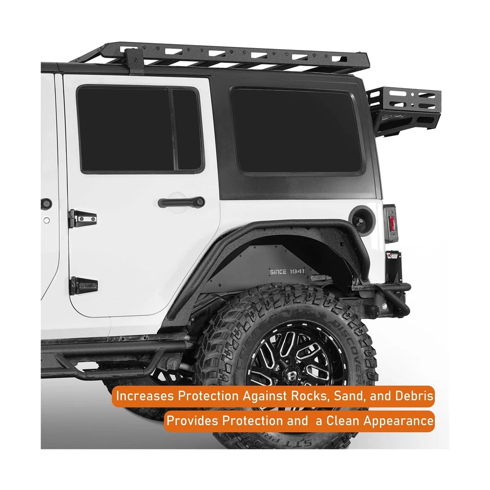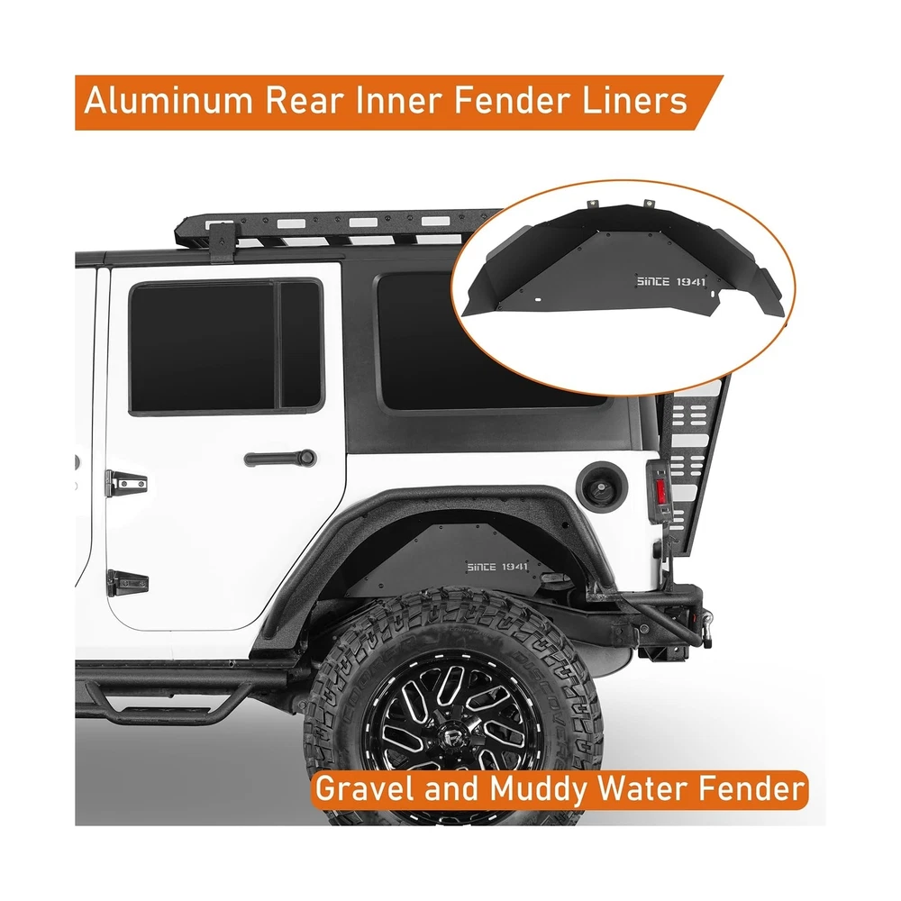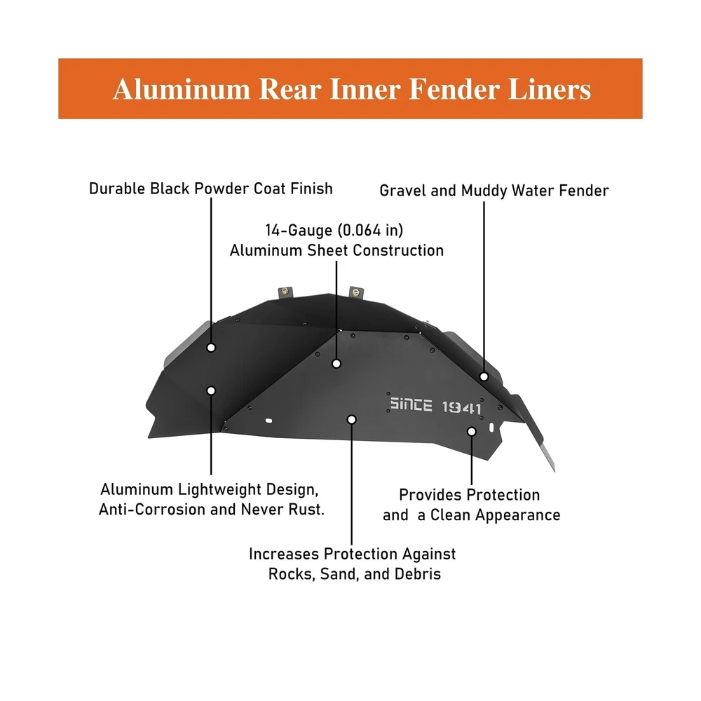 Hooke Road Aluminum JK Rear Inner Fender Liners Wheel Well Liner for 2007-2018 Jeep Wrangler JK & Unlimited 2/4 Doors, 2PCS Lightweight Mud Guard Covers Description Features: Compatibility- Hooke Road aluminum SINCE 1941 rear inner fender liners fit for Jeep Wrangler JK 2/4 Doors 2007 2008 2009 2010 2011 2012 2013 2014 2015 2016 2017 2018 Unlimited | Sports | Sahara | Freedom | Rubicon | X all models Upgraded Design- The upgraded inner liners fit the vehicle body line perfectly, precise cutting shape reserves space for modified accessories and larger clearance for bigger tires. Works well with most aftermarket shock lift systems Off-road Protection- Gravel and muddy water fender. Provides protection and a clean appearance. Featuring a fashion-forward design with "SINCE 1941" inscription. The included light grey plastic plate adds customization options, easily repainted to match your style Durable Construction- Crafted from 14-gauge (0.064 in) aluminum sheet construction, these wheel well liners are lightweight yet incredibly durable. Finished with a durable black powder coat, they're resistant to corrosion and never rust, weighing approximately 8 lbs for both durability and performance Easy Installation- Direct bolt-on installation, no drilling or trimming required. Comes with mounting hardware and detailed instruction Warranty- Manufacturer warranty for 2-Year from date of purchase. Lifetime customer support from Hooke Road Product Details: Color: SINCE 1941- for JK Rear Brand: Hooke Road Vehicle Service Type: 07-18 Jeep JK, 2007-2018 Jeep Wrangler JK Auto Part Position: Rear Installation Type: Bolt-On Color: SINCE 1941- for JK Rear Brand: Hooke Road Vehicle Service Type: 07-18 Jeep JK, 2007-2018 Jeep Wrangler JK Auto Part Position: Rear Installation Type: Bolt-On Finish Type: Powder Coated Manufacturer: Hooke Road Item Weight: 8 pounds Package Dimensions: 29.1 x 12.6 x 6 inches Exterior: Painted Manufacturer Part Number: BXG.2114-S Special Features: Offers protective function with a distinctive appearance, Decorated with words of 'SINCE 1941', Increases protection against rocks, sand, and debris Date First Available: April 29, 2024 Delivery We Do Not Ship Outside of the Continental US. Return Policy All items qualify for returns within 30 days of receipt. Buyer is responsible for return shipping on any item that is not damaged. Feedback We take our reputation seriously, we buy and sell online, so we understand the value of trust. If you are unsatisfied with your order, please contact us and we will work with you to resolve it to your satisfaction.