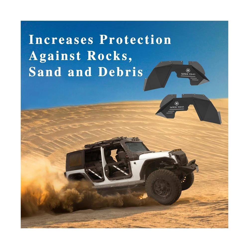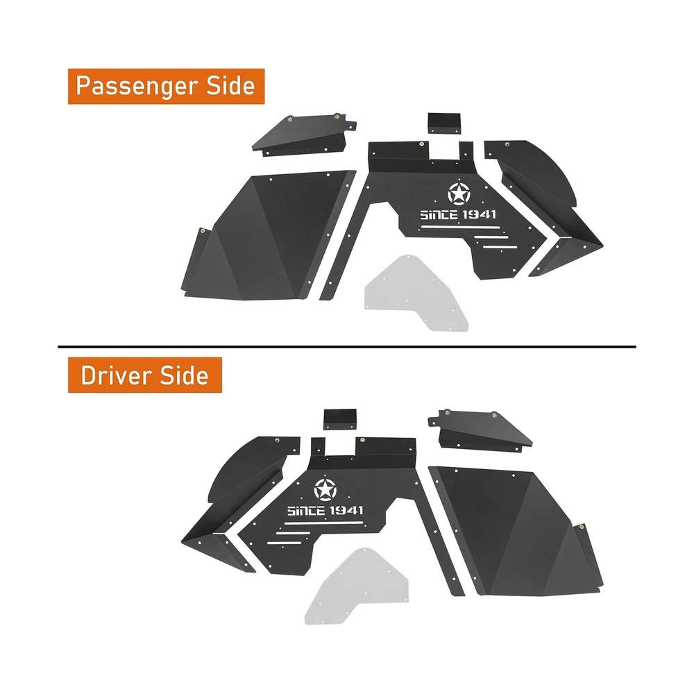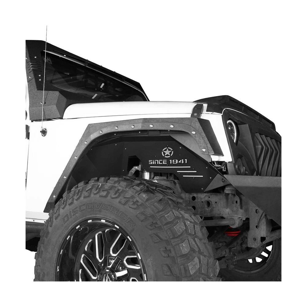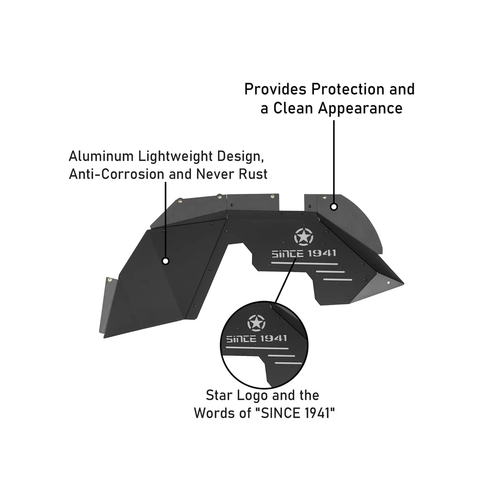 Hooke Road Inner Fender Liners Front Wheel Well Liners for 2007-2018 Jeep Wrangler JK & Unlimited Sport Sahara Rubicon 2/4 Doors (Black Aluminum) Description Features: FITMENT: SINCE 1941 Front Inner Fender Liners compatible with Jeep Wrangler JK & Unlimited 2007 2008 2009 2010 2011 2012 2013 2014 2015 2016 2017 2018 CONSTRUCTION: Product weight is about 21 lbs. These inner fender liners are made of 14-gauge (0.064 in) aluminum sheet construction, black powder coat finished, resistant to corrosion and never rust DESIGN: Gravel and muddy water fender. Fashion style design with a star logo and words of 'SINCE 1941'. Works well with most aftermarket shock lift systems Easy bolt-on installation. Need to drill one hole each side to complete installation (use self-drilling screw) You can remove the light grey plate and paint it any color you want. The plate is secure with some 4*6 rivets, you can remove it with an electric drill tool, from the front side. And you may need to buy some new rivets and use a rivet gun to install them back Package include both driver and passenger side front fender liners. Mounting hardware and installation instruction Manufacturer warranty for 2-Year from date of purchase. Lifetime customer support from Hooke Road Product Details: Brand: Hooke Road Color: Front Fender Liners Exterior Finish: Textured Material: Aluminum Item Weight: 11 Pounds Brand: Hooke Road Color: Front Fender Liners Exterior Finish: Textured Material: Aluminum Item Weight: 11 Pounds Style: Off-road Auto Part Position: Front Vehicle Service Type: 2007-2018 Jeep Wrangler JK 2/4 Doors Fit Type: Vehicle Specific Fit Manufacturer: Hooke Road Item Weight: 11 pounds Package Dimensions: 27.2 x 17.3 x 5.8 inches Is Discontinued By Manufacturer: No Manufacturer Part Number: QP.BXG-225-M Special Features: Provides protection and a clean appearance, Direct bolt-on installation, Fit the vehicle body line perfectly Date First Available: December 20, 2018 Delivery We Do Not Ship Outside of the Continental US. Return Policy All items qualify for returns within 30 days of receipt. Buyer is responsible for return shipping on any item that is not damaged. Feedback We take our reputation seriously, we buy and sell online, so we understand the value of trust. If you are unsatisfied with your order, please contact us and we will work with you to resolve it to your satisfaction.