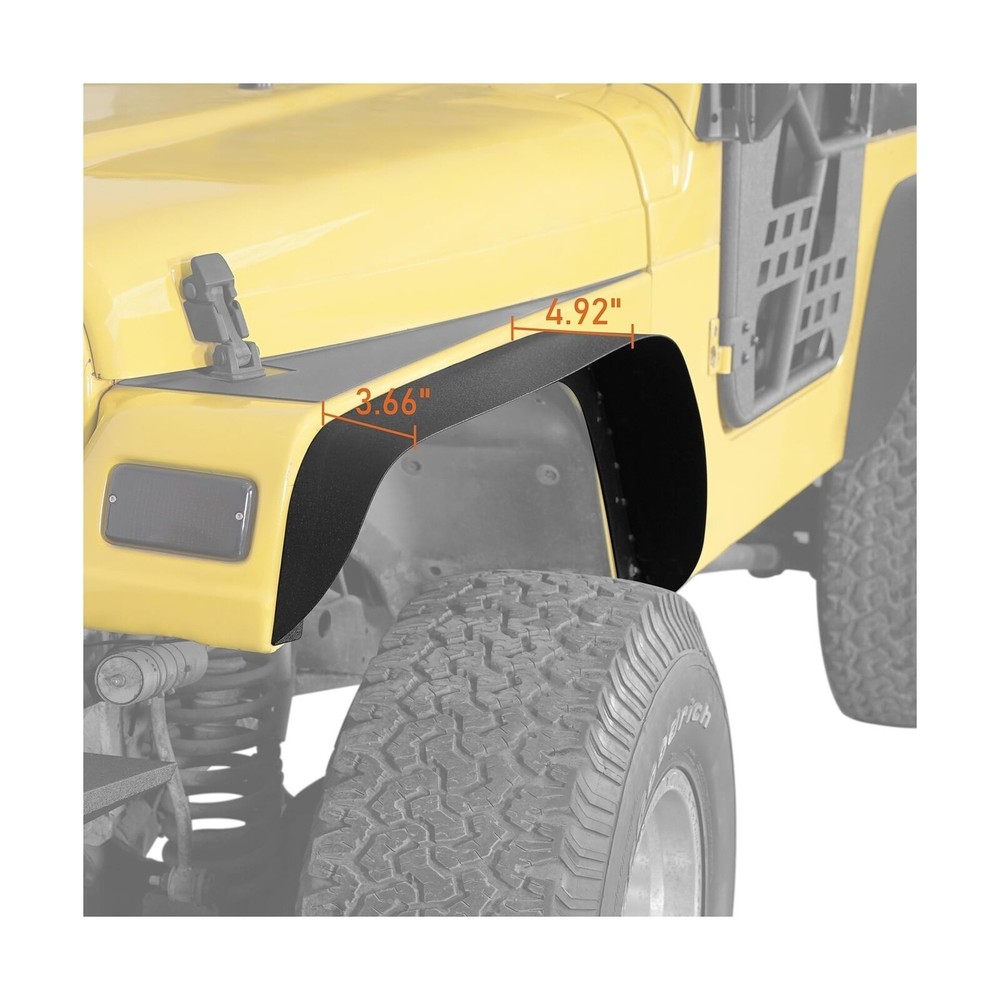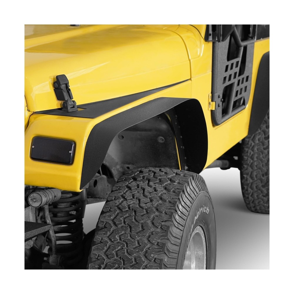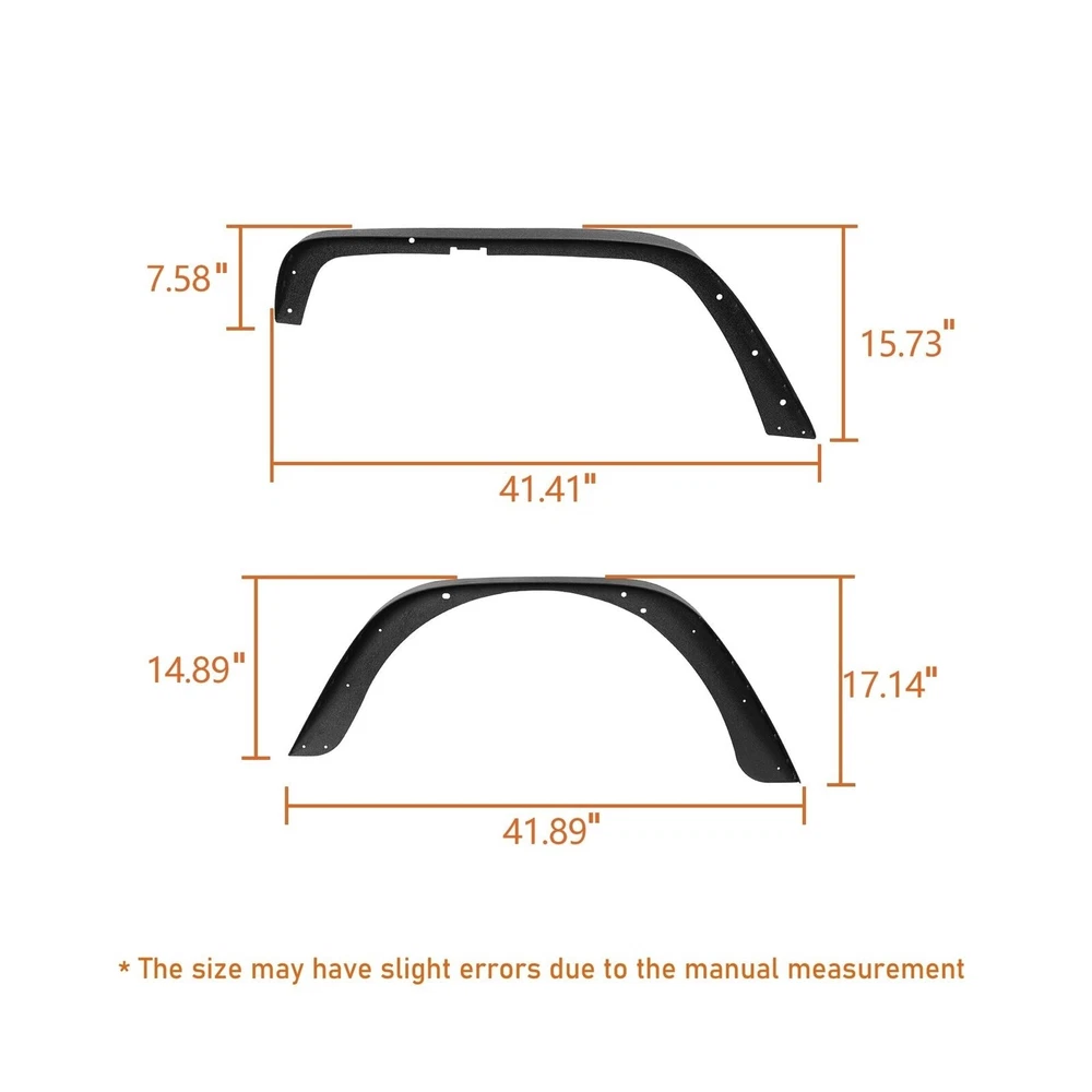 Hooke Road Wrangler TJ Flat Fender Flares, Front & Rear Steel Wheel Flares Liner for 1997-2006 Jeep Wrangler TJ - 4PCS Set Description Features: Hooke Road solid steel flat fender flares for Jeep Wrangler TJ & Unlimited LJ 1997 1998 1999 2000 2001 2002 2003 2004 2005 2006 The slim design provides extra tire coverage for larger tires while maintaining an offroad look, don't need to worry about the wheels rubbing the fender flares Protect wheel wells from mud, scratches, sand and other outer damage; Covers up existing scratches and add a rugged off-road exterior look These fender flares are built from heavy-duty 16-gauge(1/16 inch) and 14-gauge(5/64 inch) steel construction to ensure maximum durability against heavy loads. It's coated with a durable black powder coating to ensure lasting protection against corrosion Drilling is needed for front and rear fenders to ensure solid mount, but it is quite easy Package include 2 front fender flares & 2 rear fender flares, mounting hardware; user manual Manufacturer warranty for 2-Year from date of purchase. Lifetime customer support from Hooke Road Product Details: Brand: Hooke Road Color: Black Exterior Finish: textured Material: Carbon Steel Item dimensions L x W x H: 42.51 x 4.92 x 16.53 inches Brand: Hooke Road Color: Black Exterior Finish: textured Material: Carbon Steel Item dimensions L x W x H: 42.51 x 4.92 x 16.53 inches Style: Modern Auto Part Position: Front Vehicle Service Type: Jeep TJ, 1997-2006 Jeep Wrangler TJ Fit Type: Vehicle Specific Fit Manufacturer: Hooke Road Automotive Fit Type: Vehicle Specific Fit Item Weight: 35.4 pounds Product Dimensions: 42.51 x 4.92 x 16.53 inches Is Discontinued By Manufacturer: No Manufacturer Part Number: LED-BXG-056 Date First Available: February 7, 2018 Delivery We Do Not Ship Outside of the Continental US. Return Policy All items qualify for returns within 30 days of receipt. Buyer is responsible for return shipping on any item that is not damaged. Feedback We take our reputation seriously, we buy and sell online, so we understand the value of trust. If you are unsatisfied with your order, please contact us and we will work with you to resolve it to your satisfaction.