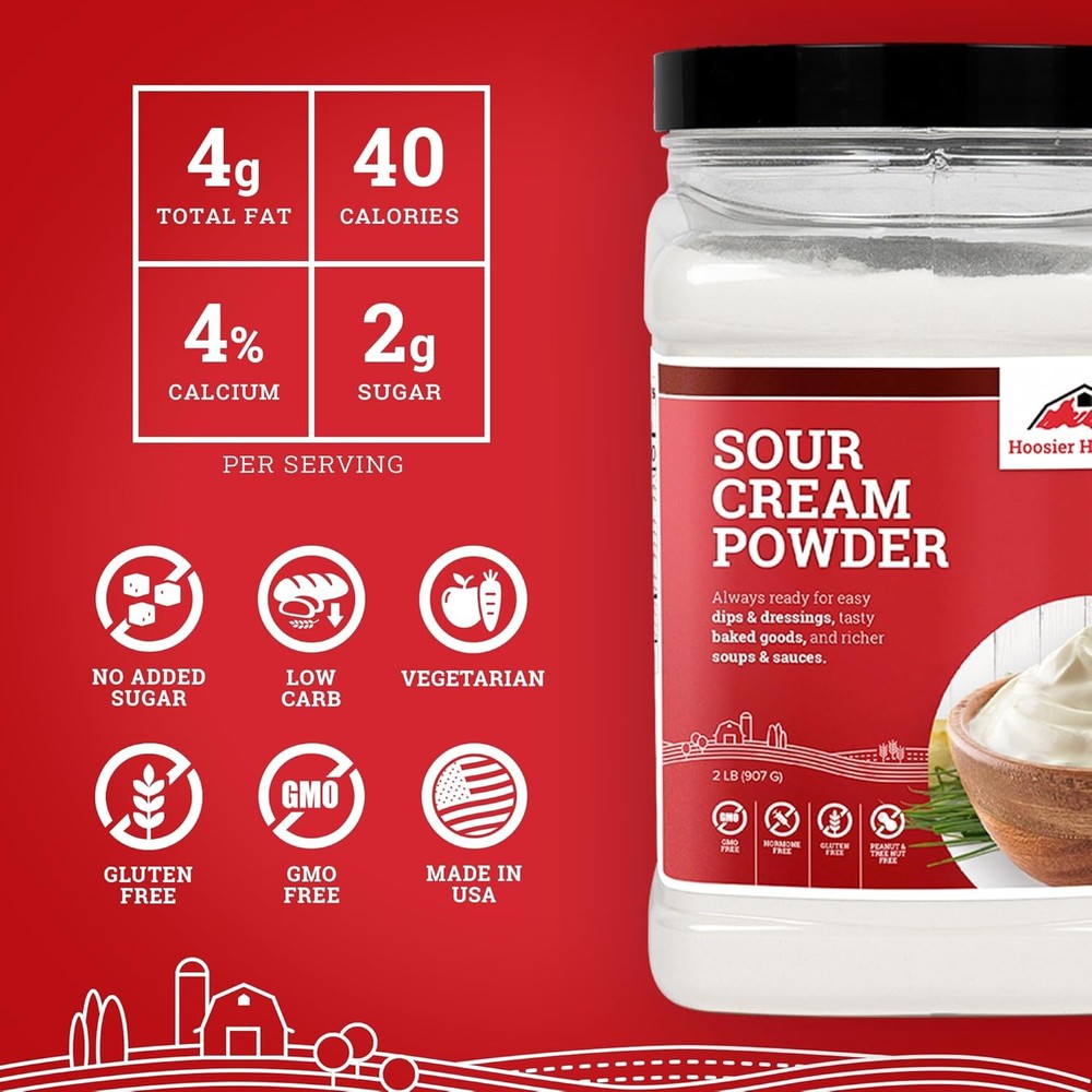 Hoosier Hill Farm Sour Cream Powder, 2LB (Pack of 1) 2 Pound Product Details Is Discontinued By Manufacturer : No Product Dimensions : 4.5 x 4.5 x 8.5 inches; 1 Pounds Item model number : HHF43 Manufacturer : Hoosier Hill Farm Units : 16.0 Ounce Brand: Hoosier Hill Farm Flavor: Sour Cream Item Form: Powder Item Weight: 16 ounces Item dimensions L x W x H: 4.5 x 4.5 x 8.5 inches Try our famous Sour Cream Powder, made from 100% real sour cream. Instantly rehydrate with cool water to get creamy, smooth sour cream. Use to create dips and sauces or add tangy flavor to muffins and cakes. To reconstitute into sour cream: mix 3 parts water with 5 parts Sour Cream Powder Store in a cool, dry place. We do not recommend refrigeration or freezing of the powder Product of the USA Contains milk. Packaged in a facility that processes dairy, soy, peanuts, and wheat products. Try our famous Sour Cream Powder, made from 100% real sour cream. Instantly rehydrate with cool water to get creamy, smooth sour cream. Use to create dips and sauces or add tangy flavor to muffins and cakes. Store in a cool, dry place. We do not recommend refrigeration or freezing of the powder. Contains milk. Packaged in a facility that processes dairy, soy, peanuts, and wheat products.