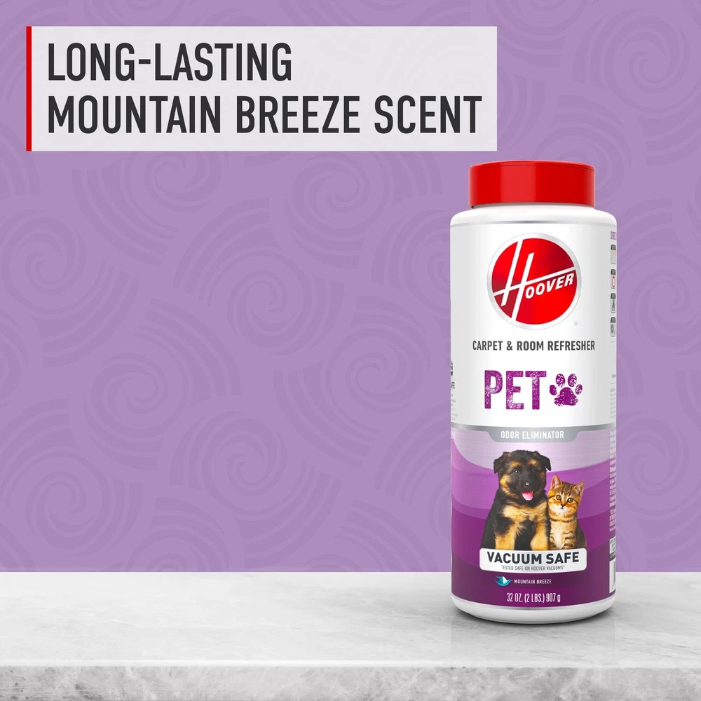 Maintain an effortlessly fresh space with Hoover Pet Carpet and Room Refresher. Specially formulated to eliminate undesirable pet smells, this versatile carpet cleaning powder is perfect for use on carpets, area rugs, couches, mattresses, pet beds and more. Simply sprinkle the powder, wait 5 minutes, and vacuum for an instant refresh. The long-lasting mountain breeze fragrance keeps your space smelling clean for days. Designed to be safe for vacuums, the Hoover Pet Carpet and Room Refresher is an easy and effective way to keep your home odor-free. For more than 100 years, Hoover has designed powerful, easy-to-use products that clean your entire home from floor to ceiling. Since 1908, consumers and businesses have trusted Hoover to provide reliable, innovative cleaning solutions. Today, we offer a comprehensive line of products for general and special-purpose vacuuming, including full-size uprights and canisters, deep cleaners and hard floor cleaners.