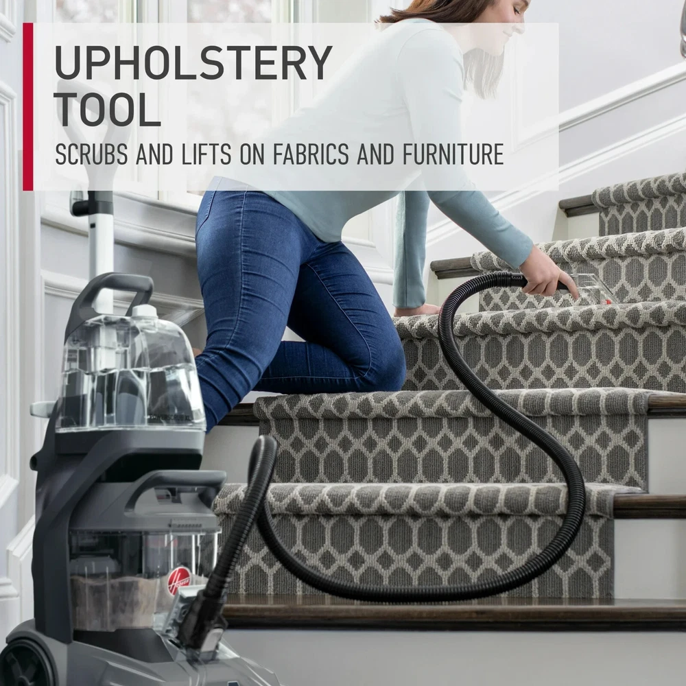Product details The Hoover PowerScrub XL Carpet Cleaner, powerfully tackles deep, set-in stains and renews your carpets for a complete, whole home clean. Easily remove stains with the combined power of the five counter-rotating SpinScrub Brushes and HeatForce faster drying. Our Recovery Tank helps you clean more without stopping frequently to empty and refill. Plus, PowerScrub XL comes with versatile tools to target stubborn messes beyond your carpets. *Hoover PowerScrub XL, Upright Carpet Cleaner Machine, FH68010, 1 Count, New Condition FIVE SPINSCRUB BRUSHES: Deep, set-in stains don't stand a chance against the five counter-rotating SpinScrub Brushes that scrub at multiple angles to loosen, lift, and remove even the toughest stains for a lasting clean SPINSCRUB + HEATFORCE: Combine the power of SpinScrub Brushes with HeatForce faster drying for a complete clean that renews your carpets from the inside out UPHOLSTERY TOOL: Scrub and lift stains on fabrics & furniture with the Upholstery Tool NOZZLE CLEANOUT TOOL: Easily clean dirt and debris from brushes with the Nozzle Cleanout Tool QUICK CLEAN MODE: Dries in as little as 30 minutes with Quick Clean Mode TWO TANKS: Clean water and formula are stored together in one tank, separate from the dirty water, so you're never cleaning with dirty water. Clean Water Tank: 1 Gal. WHAT'S INCLUDED: Upholstery Tool, Nozzle Cleanout Tool, 8 ft Hose, trial size carpet cleaner solution WARRANTY: 2-Year Limited Warranty Hoover PowerScrub XL, Upright Carpet Cleaner Machine, FH68010, 1 Count, New Condition