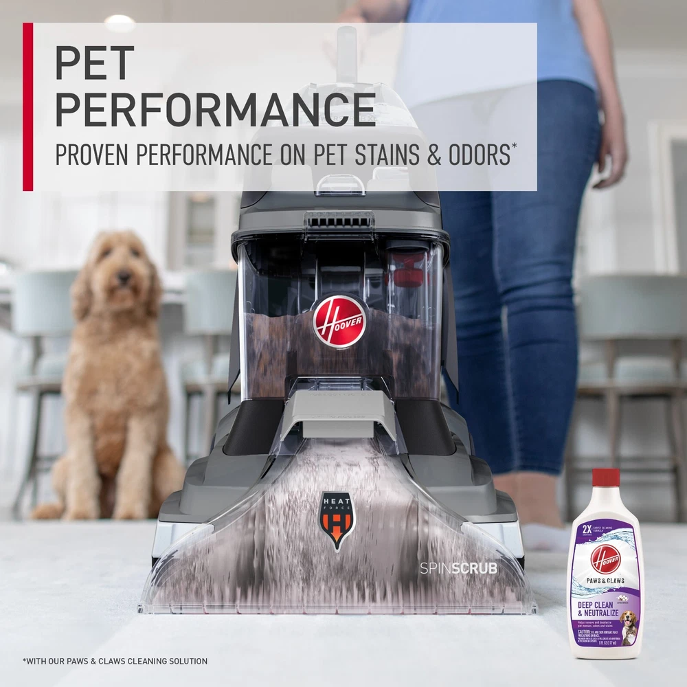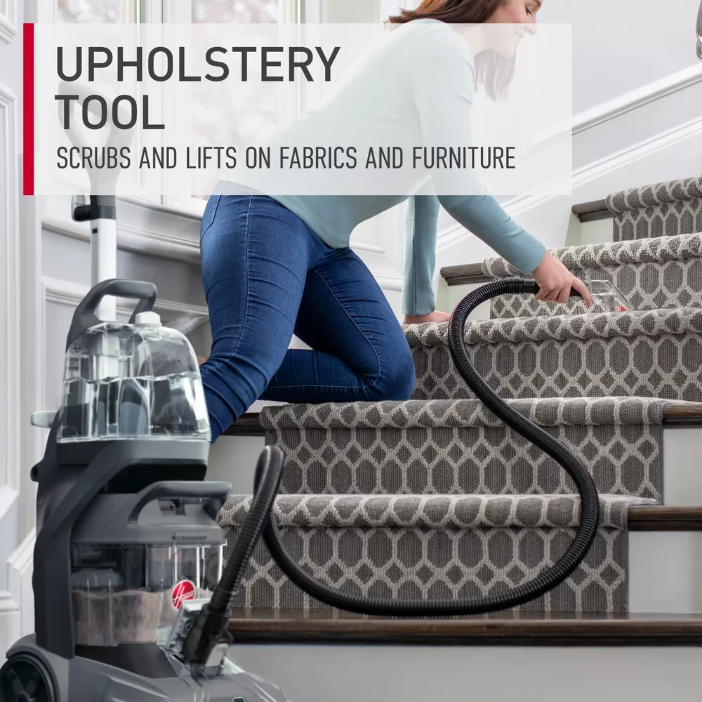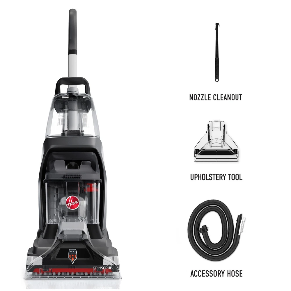 Product details The Hoover PowerScrub XL Carpet Cleaner Machine FH68010, powerfully tackles deep, set-in stains and renews your carpets for a complete, whole home clean. Easily remove stains with the combined power of the five counter-rotating SpinScrub Brushes and HeatForce faster drying. Our Recovery Tank helps you clean more without stopping frequently to empty and refill. Plus, PowerScrub XL comes with versatile tools to target stubborn messes beyond your carpets. *Hoover PowerScrub XL, Upright Carpet Cleaner Machine, FH68010, 1 Count, New Condition FIVE SPINSCRUB BRUSHES: Deep, set-in stains don't stand a chance against the five counter-rotating SpinScrub Brushes that scrub at multiple angles to loosen, lift, and remove even the toughest stains for a lasting clean SPINSCRUB + HEATFORCE: Combine the power of SpinScrub Brushes with HeatForce faster drying for a complete clean that renews your carpets from the inside out UPHOLSTERY TOOL: Scrub and lift stains on fabrics & furniture with the Upholstery Tool NOZZLE CLEANOUT TOOL: Easily clean dirt and debris from brushes with the Nozzle Cleanout Tool QUICK CLEAN MODE: Dries in as little as 30 minutes with Quick Clean Mode TWO TANKS: Clean water and formula are stored together in one tank, separate from the dirty water, so you're never cleaning with dirty water. Clean Water Tank: 1 Gal. WHAT'S INCLUDED: Upholstery Tool, Nozzle Cleanout Tool, 8 ft Hose, trial size carpet cleaner solution WARRANTY: 2-Year Limited Warranty Hoover PowerScrub XL, Upright Carpet Cleaner Machine, FH68010, 1 Count, New Condition