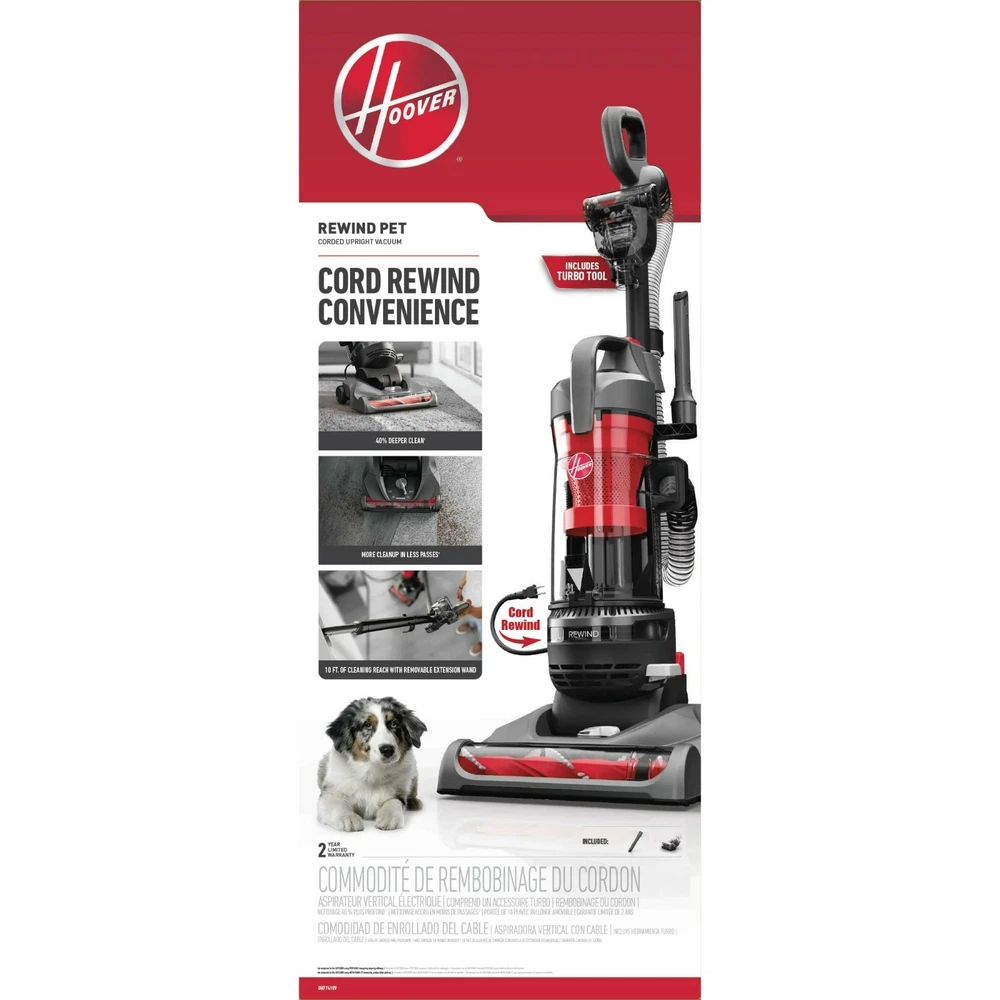 About this item AUTOMATIC CORD REWIND: The 25 ft. cord retracts automatically for convenient storage with the touch of a button MORE CLEANUP IN FEWER PASSES*: Clean more efficiently by picking up dirt and debris faster. *As compared to UH75100V using ASTM F2609-11 measuring surface litter pick-up ABOVE FLOOR CLEANING: Clean hard to reach areas easily with the built-in extension wand, and specialty tools for cleaning upholstery and stairs MULTI-SURFACE CLEANING: Powerful suction for deep cleaning any room in the home PERFECT FOR PETS: Effortless pet hair cleanup with the included Turbo Tool Hoover Rewind Pet Bagless Upright Vacuum Cleaner , Pet Friendly, Automatic Cord Rewind, Multi-Surface and Above Floor Cleaning, UH77410V, Gray & Red Bagless Y Cord length 25 ft Recommended surface Carpet Vacuum cleaner type Upright Vacuum Cleaners Power type Corded Electric Weight 15.06 lb Brand Hoover Surface cleaning machine feature Pet Hair Removal, Motorized Brush, Cord Rewind Accessories Extendable Crevice Tool, Turbo Tool Recommended use Rugs Filter type Foam Cleaning path 13 in Volume capacity 0.39 gal Amps 8 Amps Assembled product height 44 in