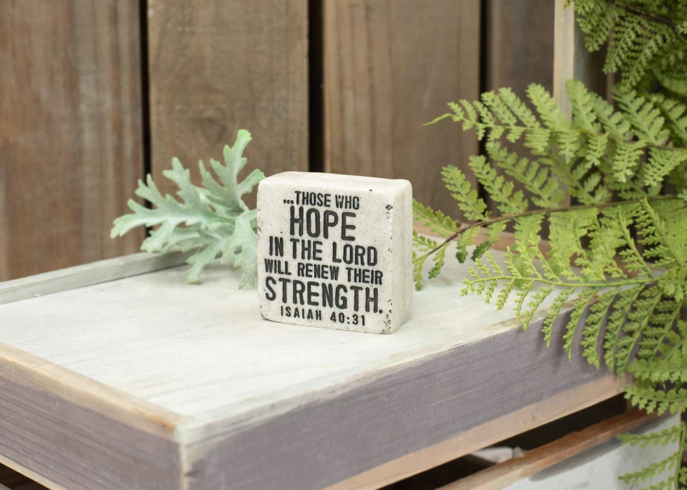 scripture stone block features simple design with deeply encouraging sentiment Features laser engraved sentiment "…Those who hope in the Lord will renew their strength. Isaiah 40:31" Made of reconstructed concrete to simulate natural-cut stone with stone texture Measures approximately 2.25 x 2.25 Inches; Display on a desk, tabletop or shelf arrangement Your purchase helps support orphans and children with special needs in Ghana, Africa