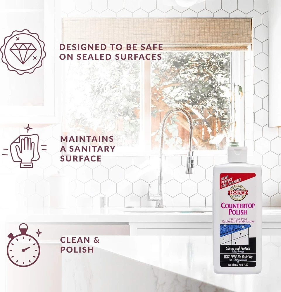 HOPE'S Countertop Restoration Polish, Streak-Free Kitchen Counter Cleaner, No Buildup Countertop Cleaner, Quartz, Marble, Corian, Composite, and Granite Cleaner and Polish, 8 Fl Oz, Pack of 2 Product Details Package Dimensions : 8.86 x 7.56 x 1.5 inches; 8 ounces Item model number : 8CT-2PK6EA Manufacturer : The Hope Company Brand: HOPE'S Item Form: Liquid Specific Uses For Product: Countertop Material Feature: Natural Item Volume: 8 Fluid Ounces Restores to a Like-New Shine: With a unique, wax-free formula, this countertop cleaner and polisher cleans your countertops and restores their original shine without any buildup Streak-Free Protection: This polish and cleaner removes spots and blemishes on your counter and acts as a protective layer to mitigate dirt, stains, and fingerprints without any residue Multisurface: Applicable for use on various solid and laminate countertop surfaces such as quartz, marble, Corian, composite, and granite; each bottle of the polish cleaner contains 8 fluid ounces Safe for You: Formulated without harsh chemicals or abrasives, this kitchen counter cleaner is safe on the skin and in households with children and pets; pleasantly scented with natural fragrances Revitalizing Formula: This counter cleaner will keep new countertops in their pristine condition and will provide a deep, rich shine to rough and stained surfaces without needing to replace them Hope’s Premium Countertop Polish is a unique formulation that cleans, beautifies, and minimizes fingerprints. Make your countertops shine like new without leaving residue behind with the nontoxic, wax-free solution. This polish works hard to keep your countertops in peak condition by mitigating future stains with a protective coating. Simply wipe the polish on and off; there is no need to use additional tools, towels, or rags to buff or complete the shine. Keep your family safe and your kitchen smelling fresh with this polish that is made without any harsh chemicals and scented with only natural fragrances. This polish delivers premium results on almost any surface, including granite, marble, quartz, composite, or Corian; it is recommended by top manufacturers such as DuPont. Use Hope’s Countertop polish on new surfaces to preserve their shine, or give new life and a glossy smooth finish to rough, damaged, or badly stained surfaces. This polish will save you money by restoring old counters that would otherwise need to be replaced. Hope’s Premium Countertop Polish is a powerful solution that brings life to all countertops whether they are new or old, shiny or dull, smooth or damaged.