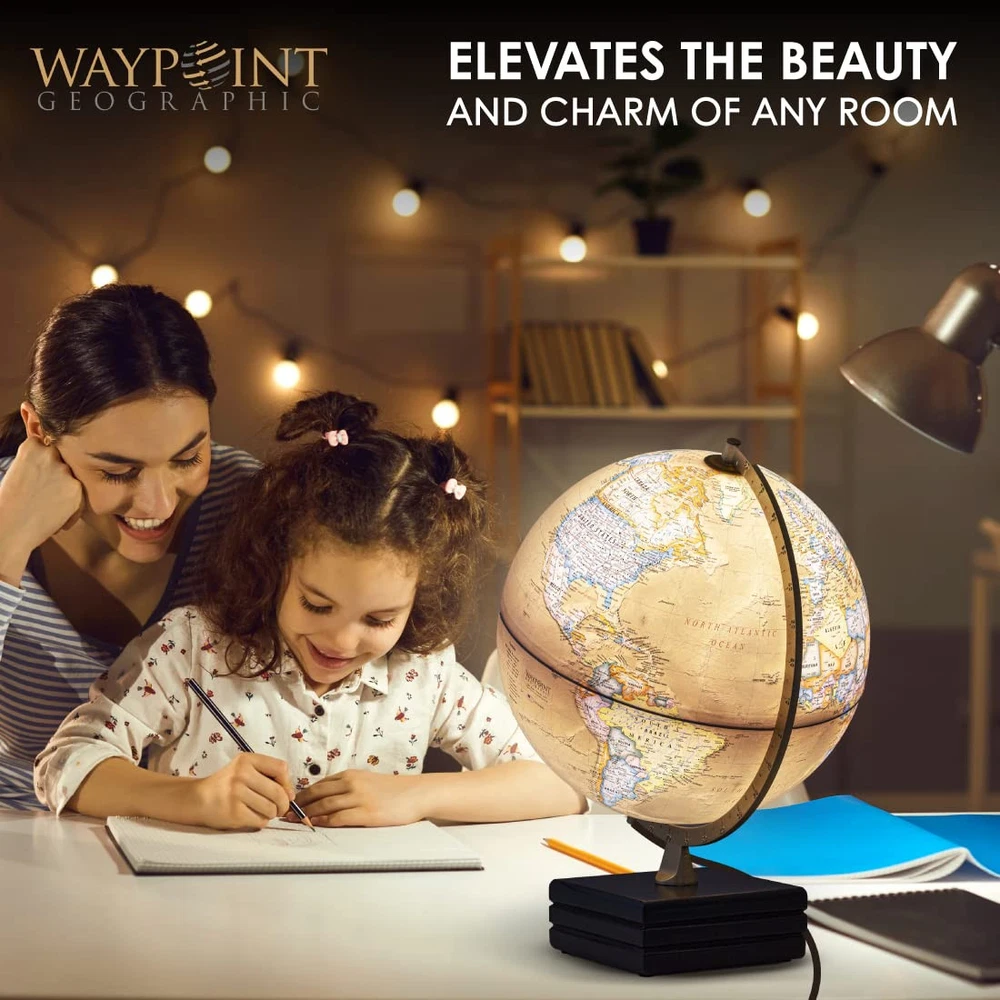 This illuminated globe is stunning—it lights up any space with elegance while offering detailed geography and ocean topography. The antique-style design with a wood base and metal meridian feels high-quality, and the updated political boundaries make it both decorative and educational. Perfect for home or office!
