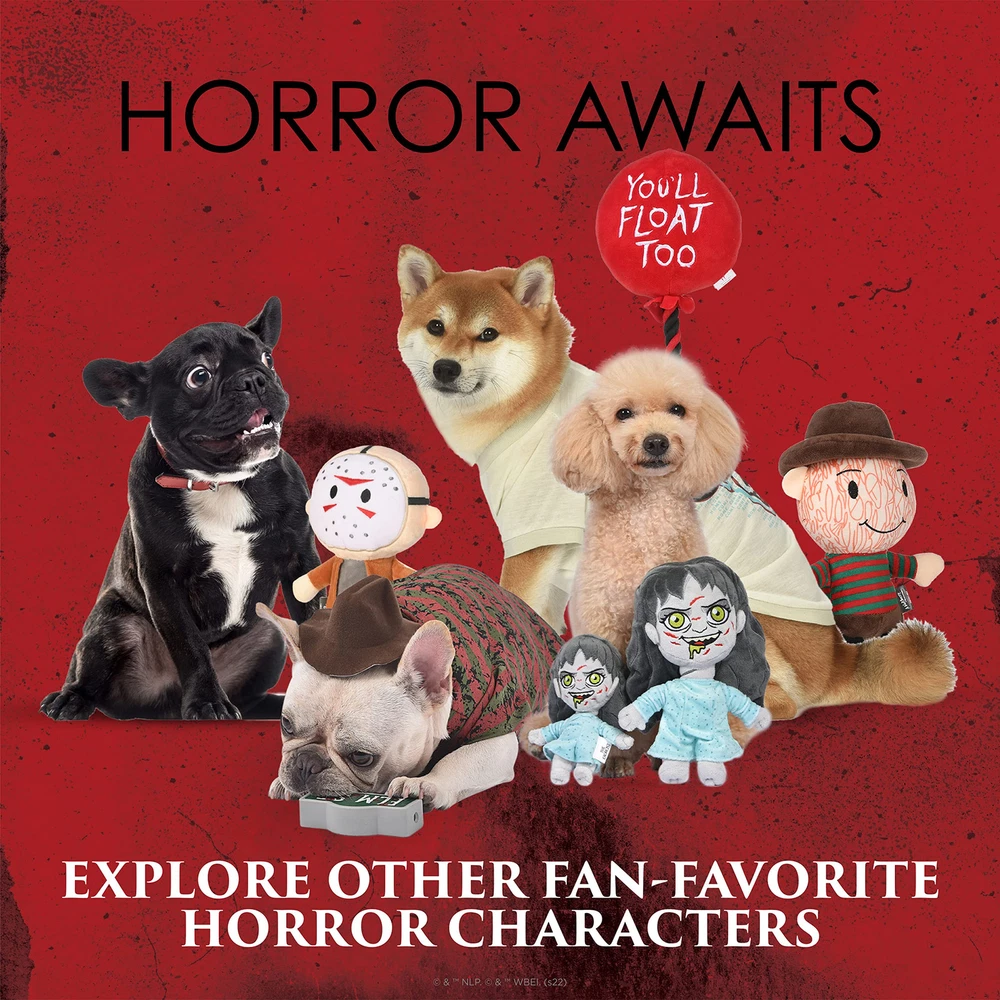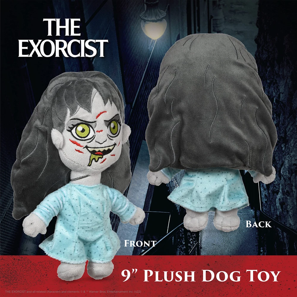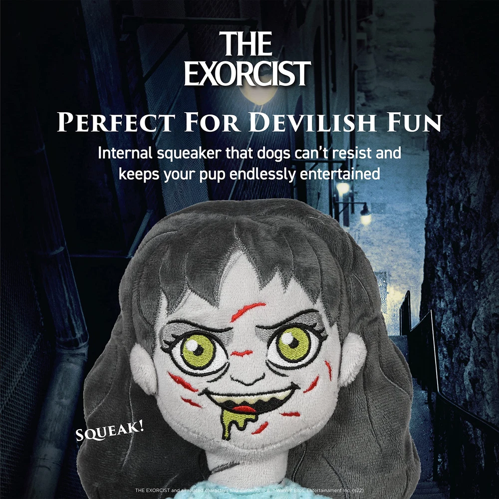 Horror fans, now you can celebrate your love of iconic horror films with the whole family – including your fur-babies! This plush dog toy is inspired by the horror classic film The Exorcist, featuring a possessed Regan, complete with her head spun all the way around on her body! The Exorcist 9” Plush Toy is perfect for afternoons of devilish fun with your pup. This dog toy is perfect to collect for your own fur-baby or to gift to other horror movie fans in your life. This plush dog chew toy is made from soft fuzzy fabric and has an irresistible squeaker inside. This dog toy for The Exorcist lovers features pet-safe plush details, meaning it has no hard plastic, sharp corners, or edges. It’s best for light chewers who love to snuggle, toss, and carry their plush dog toys. All of the design details on this pet plush squeaky toy are either embroidered or screen printed. As with all dog toys, please supervise your pet when they play with this toy. What a great new way for horror fans and their pets to collect The Exorcist! Add these dog toys to your dog’s toybox or make them part of a gift for The Exorcist lovers. For a truly epic puppy playtime for The Exorcist fans, check out our full line of horror film themed dog toys, including other characters and even costumes! For more movie-themed dog and pet toys, apparel, bowls, feeding, and accessories, browse our Fetch for Pets brand . YOUR SATISFACTION IS OUR PRIORITY* If you have any questions or feedback on this product, please reach out to us at Fetch for Pets. © & ™ NLP. © & ™ WBEI. (s21). 9 INCH PLUSH DOG TOY – Small-sized, lightweight plush that is perfect for tossing, carrying, and snuggling PET SAFE PLUSH DETAILS – All external design details are embroidered or screen printed, eliminating small or hard external choking hazards INTERNAL SQUEAKER INCLUDED - Each plush dog chew toy is made from soft fabric and contains an internal squeaker that dogs can’t resist MULTIPLE SIZES TO CHOOSE FROM: Our The Exorcist dog plush toys come in a range of sizes OFFICIAL WB DESIGN – This is an officially licensed WB dog toy for fans of the iconic films