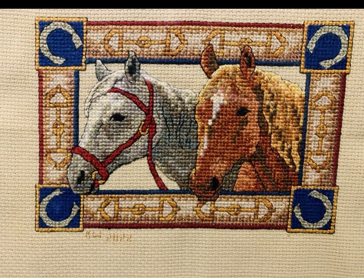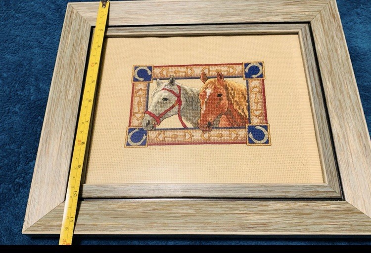 The product is a vintage cross stitch kit featuring a horse design, needlepoint style, and framed in a 12”x14” frame. This kit is an original piece from the United States, making it a unique and timeless addition to any home decor. Perfect for those who enjoy traditional and classic embroidery projects, this is a completely finished project