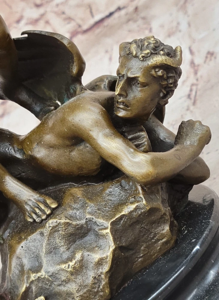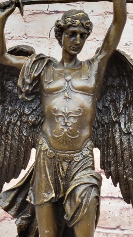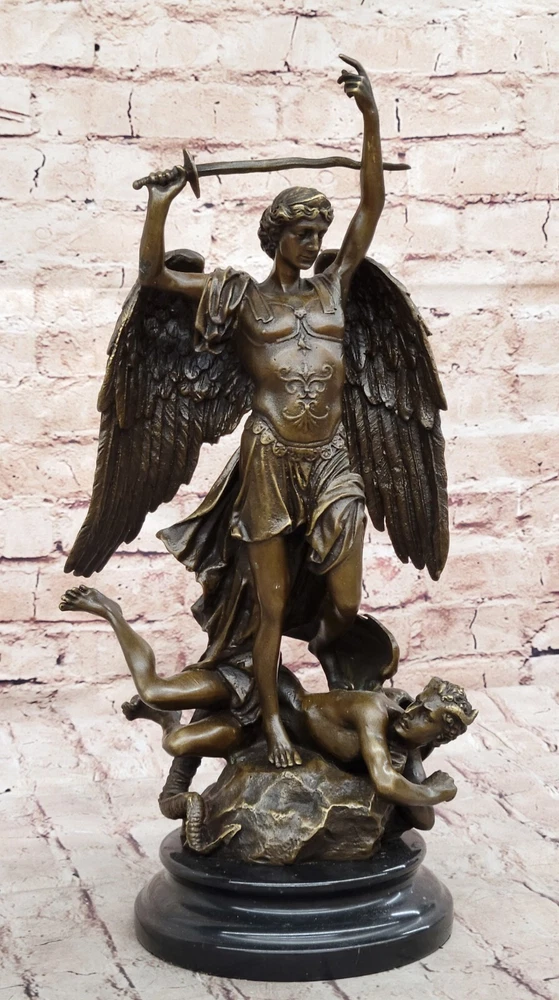 Hot Cast Archangel St Saint Michael w/ Shield Sword Color Bronze Figurine Gift Hot Cast Archangel St Saint Michael w/ Shield Sword Color Bronze Figurine Gift Condition : This sculpture is in perfect condition Bronze Dimensions with Marble Base: Height 15.5" X Width 8" Marble Dimensions: Diameter 6" Height without base:14" Weight:14 LBS Inventory:68Y4628286 Mythical Majesty in Bronze: St. Michael Slaying the Dragon This striking bronze sculpture vividly depicts a mythical figure with a dragon's tail, large wings, and a sword, standing tall with one finger raised in the air. The larger figure, exuding an imposing presence, towers over a smaller winged man who appears both frightened and awestruck, seemingly being stepped over by the dominant figure. The interpretation of this dramatic scene is left to the viewer's imagination – does this figure represent good or evil? The powerful stance and fierce appearance certainly suggest a commanding and formidable presence. Craftsmanship and Symbolism Crafted from 100% solid bronze, this sculpture captures the essence of mythological storytelling and artistic mastery. The intricate details of the figures, from the texture of the wings to the tension in their poses, highlight the artist's skill and attention to detail. The larger figure's dominating posture over the smaller winged man evokes a sense of power and conflict, inviting viewers to ponder the underlying narrative. A Statement Piece for Any Space Mounted on a black marble base, the sculpture gains a sense of weight and importance, enhancing its overall impact. Whether you are an art collector, a mythology enthusiast, or simply someone who appreciates the beauty and craftsmanship of bronze sculptures, this piece is sure to impress. It stands as a stunning work of art that adds character and depth to any space it occupies, making it a focal point and conversation starter. Signed Carpeaux Good Vs Evil Angel Striking Devil Bronze Marble Sculpture Statue www.bronzhaus.com Video will open in a new window Using the eBay App? Paste link into a browser window: [isdntekvideo] Shipping Terms : Most of our items are shipped via USPS (United States Postal Service) mail or UPS. Most orders are shipped within 24-48 hours of purchase. Please be aware that not all items are available for USPS shipping due to size and weight. We do ship to Hawaii, Alaska, Canada, Puerto Rico, APO/AE, and U.S. Virgin Islands, however, an additional charge may be required. Please contact us before making any purchases in these areas. For Non-USA customers, you may be responsible for all duty, tax, brokerage fees that may be due upon delivery (shipping costs cover freight charges only). We also ship internationally. Please refer to the "Shipping and Handling" chart for the rates for each area. Payment : We accept just about any form of payment. PayPal, Master Card, Visa or American Express credit cards. Money orders, cashiers checks, and even personal or business checks. For governmental institutions, we will also accept a purchase order. Please understand that for personal or business checks we have to wait for the check to clear (usually 7 days) before shipping. Condition : New Detailed Hand Crafted Hot Cast Bronze Satisfaction Guaranteed. This is Stock Photo, Slight Color Variation!! Listing and template services provided by inkFrog