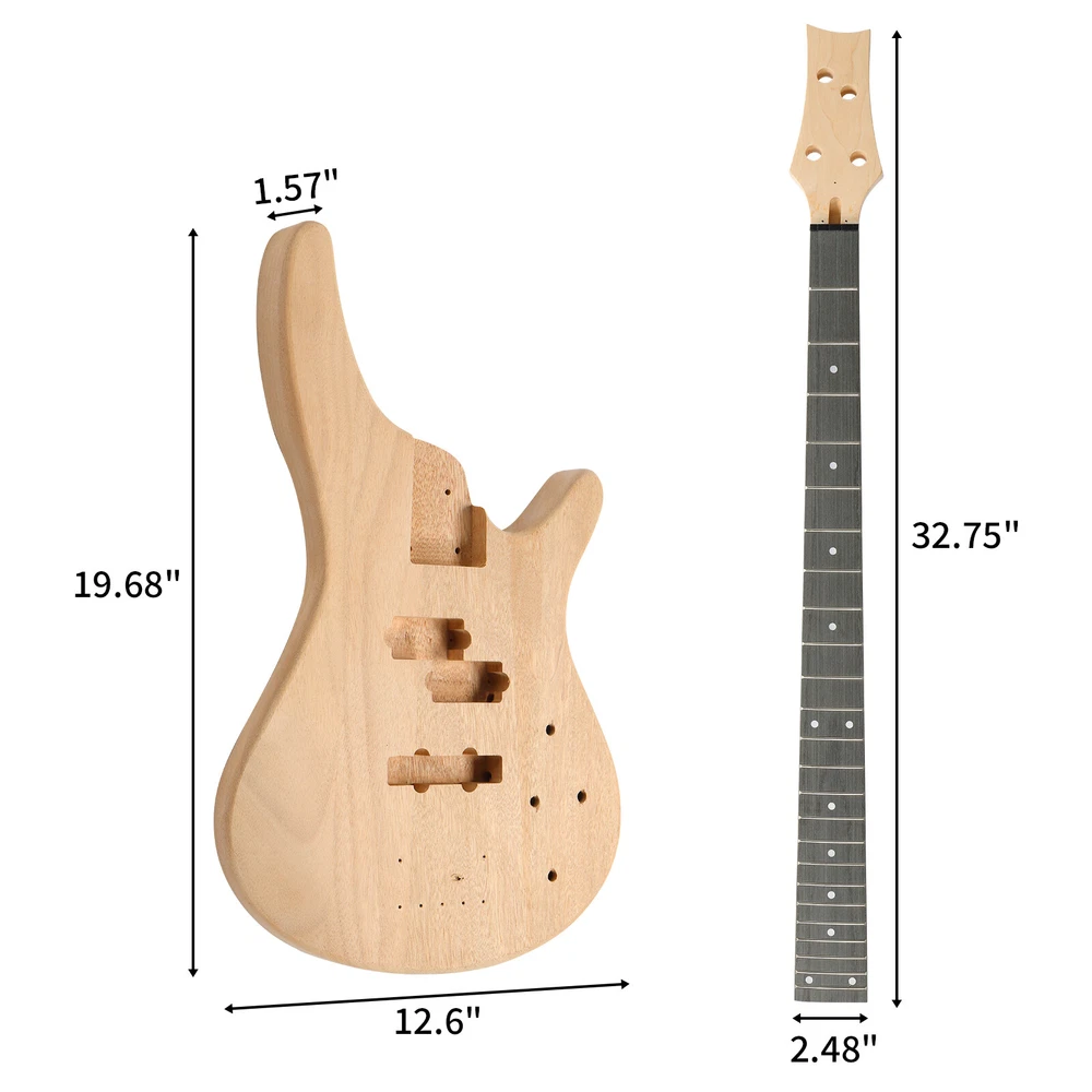 Introductions: The 4 string IB style bass with Mahogany Body, Maple Neck and Accessories. Easy to install,No welding is required during the entire installation process. This DIY electric bass guitar kit have all pre-installed wiring plugs.The best choice for DIY lovers Features: The strings range from Thin to Thick Were E-A-D-G 4 String IB style electric bass guitar DIY Kits,Solid mahogany body and maple neck If you want to play a better noise reduction,You can be pasted with copper foil paper to the positions such as the wires compartment and the pickup groove. No welding is required during the entire installation process. This DIY electric Bass guitar kit have all pre-installed wiring plugs. We have attached installation instructions, if you need installation videos, you can contact us Specifications: Style: IB Style Electric Guitar Body Orientation: Right Handed Body: Mahogany Guitar Body Color:burlywood 3. Neck and Fingerboard Neck: Maple Fingerboard: Rosewood Strings: 4 Strings Dimensions: G-0.045", D-0.065", A-0.08", E-0.1" Frets: 24 Nut width: 1.656 in. (42 mm) Scale Length: 34" Neck Shape: "C" Shape 4. Pickups & Hardware Pickups: Split Single-Coil Pickup; Single-Coil Pickup Control: Two Volume Controls; Two Tone Controls Hardware: Fixed(Chrome) Strings Material: Nickel-plated carbon steel 5. Dimensions Body Size: (20 x 12.6 x 1.65)" / (50.8 x 32x 4.2)cm(L x W x H) Package Includes: 1 x Eletric bass guitar 1 x Guitar Strap 1 x Amp Wire 1 x Wrench Tool 1 x Plectrum 1 X operating manual