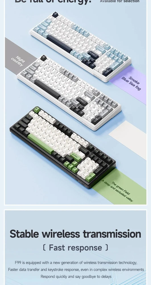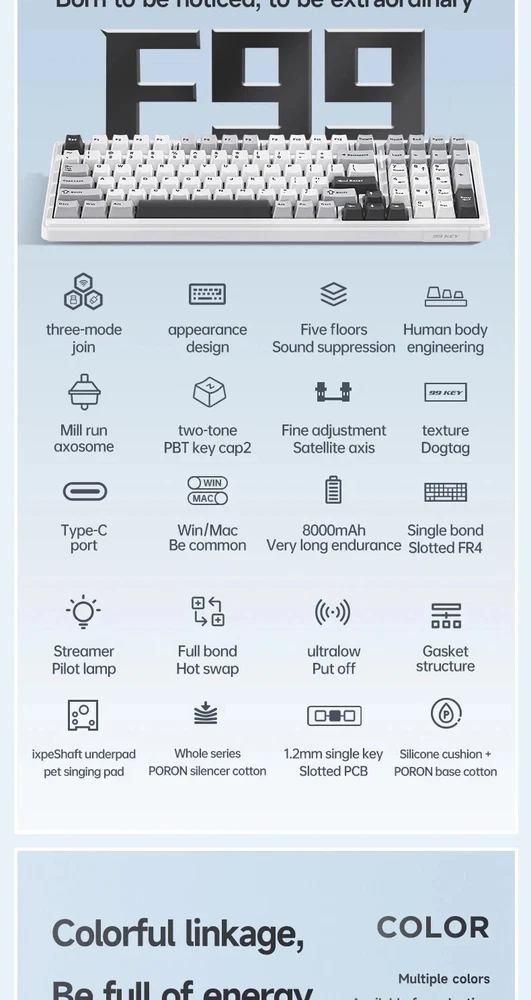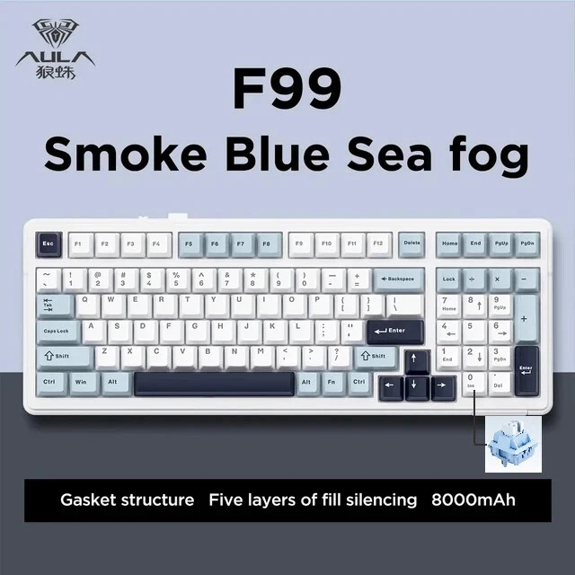 • Mechanical Operation : Experience seamless gaming with the Aula F99 Mechanical Keyboard, designed for gamers who demand high performance and responsiveness. • Bluetooth Wireless Connectivity : This keyboard offers Bluetooth wireless connectivity, ensuring you can game uninterrupted whether you're using a PC or a laptop. • Three Modes : The Aula F99 comes with three modes - wired, Bluetooth, and hot swap, giving you flexibility and convenience in your gaming setup. • PBT Gasket RGB : Equipped with PBT gasket RGB, this keyboard not only delivers superior comfort but also adds a stylish touch to your gaming setup. • 98 Keys Standard : With its 98 keys standard, this keyboard provides a complete typing experience, making it perfect for both gaming and office use. • Multilingual Support : The keyboard supports English, Chinese, and other languages, catering to a global user base. Multi-Device and Tri-Mode Wireless Connectivity: Bluetooth 5.0 & 2.4G & Type-C Cable AULA F99 supports USB wired, 2.4G wireless and Bluetooth 5.0 connection,a convenient and versatile option for users who use multiple devices and want a keyboard that can easily switch between different modes.It‘s compatible with Laptop, iPad, IOS, Windows, Mac or Android. No fussy connection process!An indicator light on the right side of the keyboard shows the state of the battery. Grey wood Switch Shaft Material:POM Shaft Type:Linear Shaft Total Stroke:3.6-0.3mm Initial pressure:30 gf Min Conduction stroke:1.50.3mm Conduction pressure:40±3 gf Bottom pressure: 53±3 gf Mechanical life: approx. 60 million cycles Nimbus V3 Switch Shaft Material: POM Shaft Type:Linear Shaft Total stroke:3.7±0.3mm Initial pressure:28 gf Min Conduction stroke:1.3±0.3mm Conduction pressure:34±3gf Bottom pressure:45±3gf Mechanical life: approx. 60 million cycles AULA F99 Mechanical Keyboard Specification: -Connection: Type-C wired & 2.4G Wireless & Bluetooth - Keys: 99 keys -Hot swapable: 3-pin/5-pin hot-Exchange - Backlight: RGB Back Light - Profile: Cherry profile -Product size:390.63X146.78 × 42.57mm - Product weight: Approx.1132g (without cable/receivery/Approx.1183g (with cable/receiver) - Rated Voltage:DC 3.7V(Full 4.2V) - Capacity:8000mAh(2*4000mAh) rechargeable Li-ion Battery - Charging Voltage/Current:DC 5V/= 830mA - Rated current: 150mA @3.7V (default light effect)/20 mA(off all lights) - Endurance:Approx.53 hours (default light effect)/Approx.400 hours (all lights off) - Operating system: WIN XP/7/8/10/Android/IOS/MAC - with software Gasket Structure with 5-layer noise reduction F99 is a high-end gasket-mounted keyboard with a PC plate. The keyboard also has a 5-layers premium silicone pads and noise reduction cotton to reduce 95% hollow noise,abosord typing noise,and enhance the unique soft and comfortable rebound of the Gasket structure. RGB backlight & Programmable software AULA F99 has multiple RGB backlit modes that you can easily switch with simple shortcuts. You can make your RGB effects with the included software. With the software, all kinds of keyboard key functions could be set, macro recorded, and personalize your function keys as you wish. The onboard flash memory unit could save the configuration to the keyboard if offline. Large capacity battery,excent endurance AULA F99 equipped with built-in 8000mhA capacity lithium battery, which can be charging through the Type-C cable while using in wired mode. When fully charged, it lasts 53 hours with the lights on, and about 400 hours with the light off. Cherry Profile PBT Meterial Double Shot Keycaps PBT keycaps is much higher than ABS material in durability, and the surface will not be shiny after long-term use, bringing a comfortable operating experience. Hot Swappable PCB, Compatible with 3Pin/5Pin Switch F99 is equipped with hot-swappable PCB to ensure free replacement or change of switches. It is compatible with most 3-pin and 5-pin mechanical switches. Pre-installed the pre-lubed custom switches providing unrivaled tactile responsiveness with up to 50 million keystroke lifespan. Side features designed for easy switching The three-mode switching and receiver storage slot are located above the keyboard. Side switching does not require flipping.which is simple and elegant. Height adjustable, to perfectly fit your comfort. With two-stage adjustable foot support design,you can autonomously adjust the bottom with non-slip rubber pads at the bottom of theinput angle of your preference, bringing a more stable use experience.