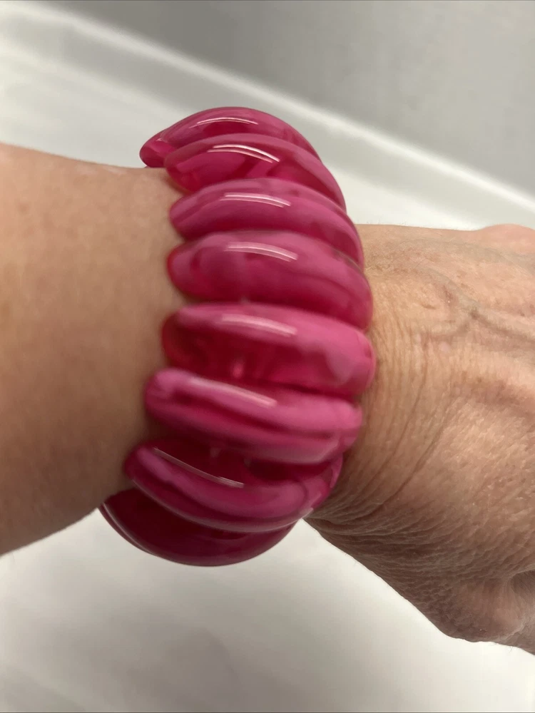 This hot pink Lucite stretch bracelet exudes a very retro 80's vibe. The bracelet is designed with a vibrant pink color and features a stretchy design for easy wear. Its retro style makes it a standout piece that can add a fun pop of color to any outfit. The unbranded nature of the bracelet adds to its unique and vintage appeal, making it a versatile accessory for those who love retro fashion. Each piece of Bracelet is appx 1.5"