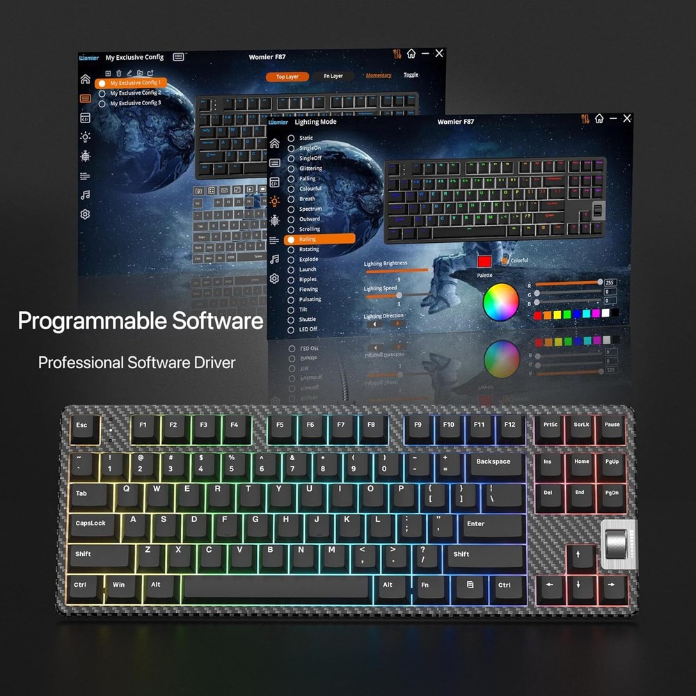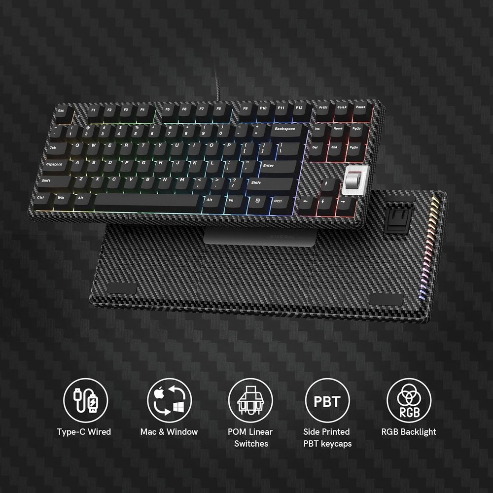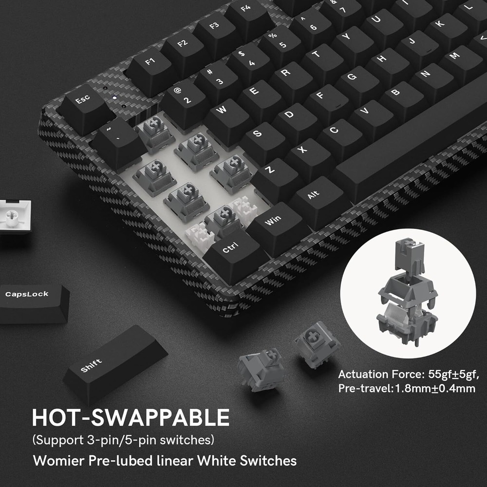 Product Description F87 75% Keyboard with Volume Scroll Wheel Mechanical Gaming Keyboard,Hot Swappable Custom Keyboard with PBT keycaps,Pre-lubed Stabilizer for Mac/Win,RGB Backlit,Carbon Fiber Pattern Theme 【ABS material & Wired Mechanical keyboard 】 F87 carbon fiber pattern mechanical keyboard only supports Type-C connection. The keyboard uses water transfer technology to print carbon fiber patterns on the ABS keyboard shell, and adds a glossy oil protective film, the pattern is clear, the color is bright and not easy to fall off. The bottom case of the keyboard is made of glossy material, so that the bottom of your keyboard is as bright as a mirror. 【Linear Switch & Hot-Swappable Custom Keyboard】This custom mechanical keyboard base is hot-swappable and supports 3-pin or 5-pin switch replacement. Even keyboard beginners can easily DIY their own keyboard. The F87 mechanical keyboard is equipped with a pre-lubricated linear axis switch for smooth typing and pleasant mechanical sound, providing fast response for your games. 【Double Shot & PBT keycaps】These PBT keycaps use a double shot process, more durable, fast, sweat resistant, feel more comfortable. For the color of the key cap, we chose a minimalist style of black and white key cap, and the black and white key cap has been a classic model, so that your keyboard is stable and popular. 【Sound Control Wheel & WIN/MAC compatibility] The keyboard comes with a unique sound control wheel that precisely adjusts the volume without interfering with your workflow. Scroll up to increase volume, scroll down to decrease volume. Before use, select MAC Mode or Win mode on the keyboard according to the system. The keyboard supports WINDOWS XP/7/8/10/11 and MAC. 【RGB Backlit Keyboard 】 The F87 keyboard is equipped with stunning RGB lighting effects, and RGB light bits are also added to the sides of the keyboard. The keyboard has 19 preset lighting effects that add a great atmosphere to the game. And support cool music rhythm lighting effects and drivers. Lighting brightness and lighting effect can be adjusted by FN+ key combination. You can choose the lighting effect according to your needs. You can turn off the backlight if you don't need it. About Us We are a reputable seller with many years of experience selling on eBay. Our goal is to provide high-quality products and excellent customer service. Shipping Items will be shipped within 1-3 business days when we received payment. (Orders are not processed on weekends & holidays) Tracking information will be sent once item is shipped. Delivery time depends on destination and other factors Item is shipped to ebay address. Leaving correct address can minimize delay. For international shipping and shipping to Guam, Hawaii and Alaska, Please contact us before placing the order. International buyers please note: Import duties, taxes and charges are not included in the item price or shipping charges. These charges are buyer’s responsibility. We will try our best to reduce the risk of the custom duties. Local pick-up is unavailable at the moment. Contact Us We reply any email messages within 1 business / working days(off-duty at weekend). If you do not get a response from us, then please check your junk or spam mailbox. Our Business hours: Mon-Fri 9:00-18:00, UTC/GMT +8 hours. Please contact us either by clicking "contact seller" in the "purchase history" section or simply click "ask a question" at the bottom of this page. If you are unsatisfied with our item or service, please contact us before leaving any feedback. We are committed to resolve all issues in a friendly and satisfactory manner.