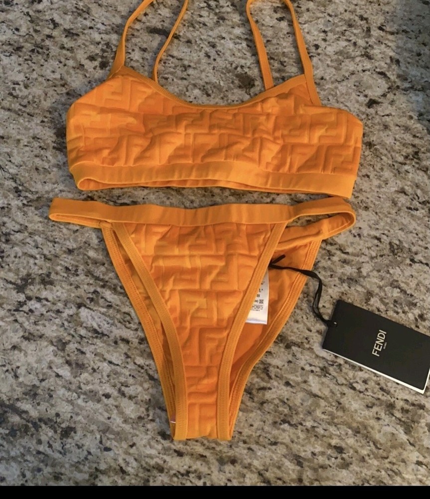 The authentic Fendi bikini is a stylish and high-quality piece of swimwear designed for women. This bikini top in vibrant orange color features adjustable straps and a stretchy material for a comfortable fit. Perfect for a beach day or poolside lounging, this bikini exudes a colorful and playful theme, making it a fashionable choice for your next summer vacation.