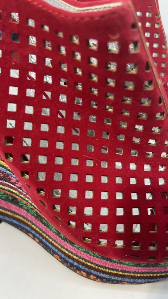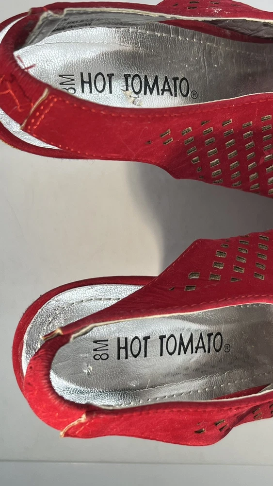 Elevate your shoe game with these stunning Hot Tomato wedges! Perfect for any occasion, these red faux suede shoes feature a peep toe and a 1.5" platform height, making them both stylish and comfortable. The geometric pattern adds a touch of bohemian flair, while the whimsy and fairytale theme make them perfect for any festival or going out event. These shoes are versatile enough to be worn for casual outings or parties and cocktails. With a M shoe width and a US shoe size of 8, they are perfect for women who want to make a statement with their footwear. Don't miss out on the opportunity to add these unique wedges to your collection!