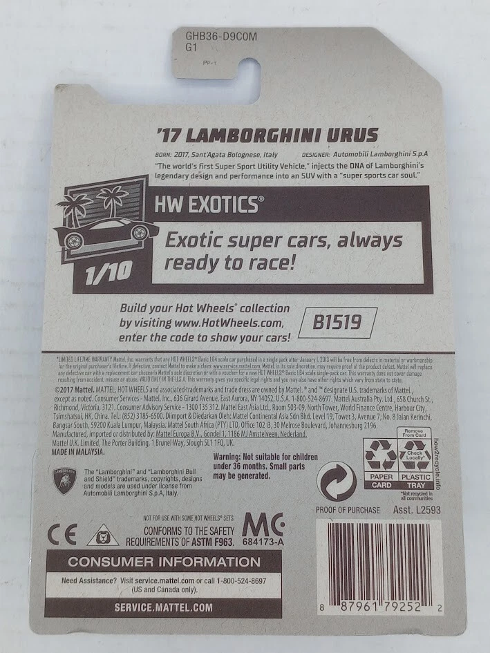 Hot Wheels '17 Lamborghini Urus b190 SKU#101267 Look closely at the pictures to see further details. We ships USPS PLEASE see photos for detailed condition!! AC PLEASE LOOK AT THE PHOTOS CAREFULLY BEFORE PURCHASING!! If you are purchasing more than one item from us and would like combined shipping, PLEASE request an adjusted invoice from us while still in the cart and BEFORE paying. eBay does not usually calculate combined shipping accurately and you might get overcharged. Please be aware that when we photograph items, we use lighting that will show the details well. Although we try to present the product as accurately as possible, the lighting may affect the overall look of the item by appearing lighter/darker or possibly a different hue than the actual item. Depending on the type of lighting you have in your home, there may be some differences between the photos and the actual item. If this is a concern of yours, please feel free to request additional photos made in natural lighting or ask for a more detailed description of the item PRIOR TO PURCHASE! PLEASE NOTE: We greatly appreciate your interest in our item for sale. We look forward to a pleasant, quick and satisfying transaction for everybody, so please note the following information before bidding. Thank you! ITEM DESCRIPTIONS: * We will try to describe items well and provide plenty of photos. Please review these carefully before bidding or purchasing. * Only the items pictured and described are what you will receive when purchased. * We will occasionally offer an item clearly marked "AS-IS". This means that we are not sure if it works because we are unable to test it for whatever reason. We will offer these at a discounted price then a similar "working" item. It is possible that these items will work fine, but it also is possible that these items are more useful for their parts. Please only bid on or purchase these items if you are well aware of this, as we will only provide refunds of actual item price (no shipping cost refunds) for these items. * If you have any questions that aren't addressed by the descriptions or photos, please feel free to ask before you bid. * May need detailed cleaning SHIPPING: * We usually do not offer shipping to international addresses, but ARE WILLING TO TAKE CONSIDERATIONS. * We try to pack items as carefully as possible, but damage may occur during shipping. If you receive an item that was damaged in shipping, please contact us and we will work with you to resolve the problem. * We will combine shipping costs for all items the same buyer purchases from us within 2 days. Please wait to pay for items until you're done shopping with us. Please contact us if you're expecting to buy more items from us, or to have us adjust the shipping costs. * We will usually ship items out within 24 hours of payment being received Sunday through Friday at noon. We will notify the buyer if there will be a delay in shipping for some reason. Please allow additional time for holidays and weekends when the post office is closed. If payment is received after noon (EST) on Friday, the item might not be shipped until the following Monday. * We do try to recycle shipping materials as much as possible. RETURNS: We abide by eBay's Money Back Guarantee. We definitely want our customers to be happy with their purchase! You may return an item within 30 days of receiving it with the following guidelines: * If the item is defective or damaged (unless we clearly marked the listing "AS-IS"), the buyer will receive a full refund after the buyer returns it and it is received by us. Customers who falsely claim their item is defective, damaged, or not as described in order to receive a full refund and free return shipping will be permanently blocked from making future purchases from us. * If the item is as described (including "AS-IS" items) and the buyer decides for any other reason than defective/damaged to return it, only the actual price of the item will be refunded once it has been returned and it is received by us. The buyer will be asked to pay all original and return shipping charges. This includes all reasons other than defective/damaged, including wrong size, wrong type, changed mind, etc. All "AS-IS" items will fall into this category of return. Please make sure the item is what you want before purchasing it. * Please contact us before initiating a refund request. FEEDBACK: We always leave feedback at the end of transaction. We consider the transaction to be over when we receive feedback from the buyer confirming the item arrived satisfactorily. If you are unsatisfied with your purchase please contact us before leaving neutral or negative feedback. WE APPRECIATE POSITIVE FEEDBACK IF YOU ARE SATISFIED WITH YOUR PURCHASE! THANK YOU FOR YOUR INTEREST IN THIS ITEM!