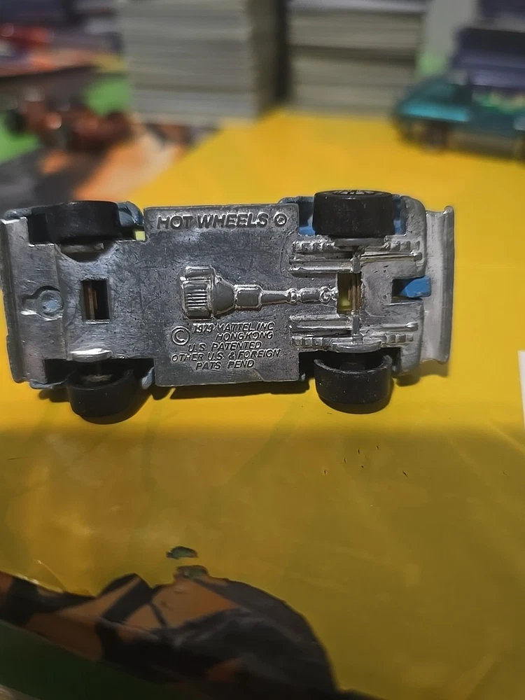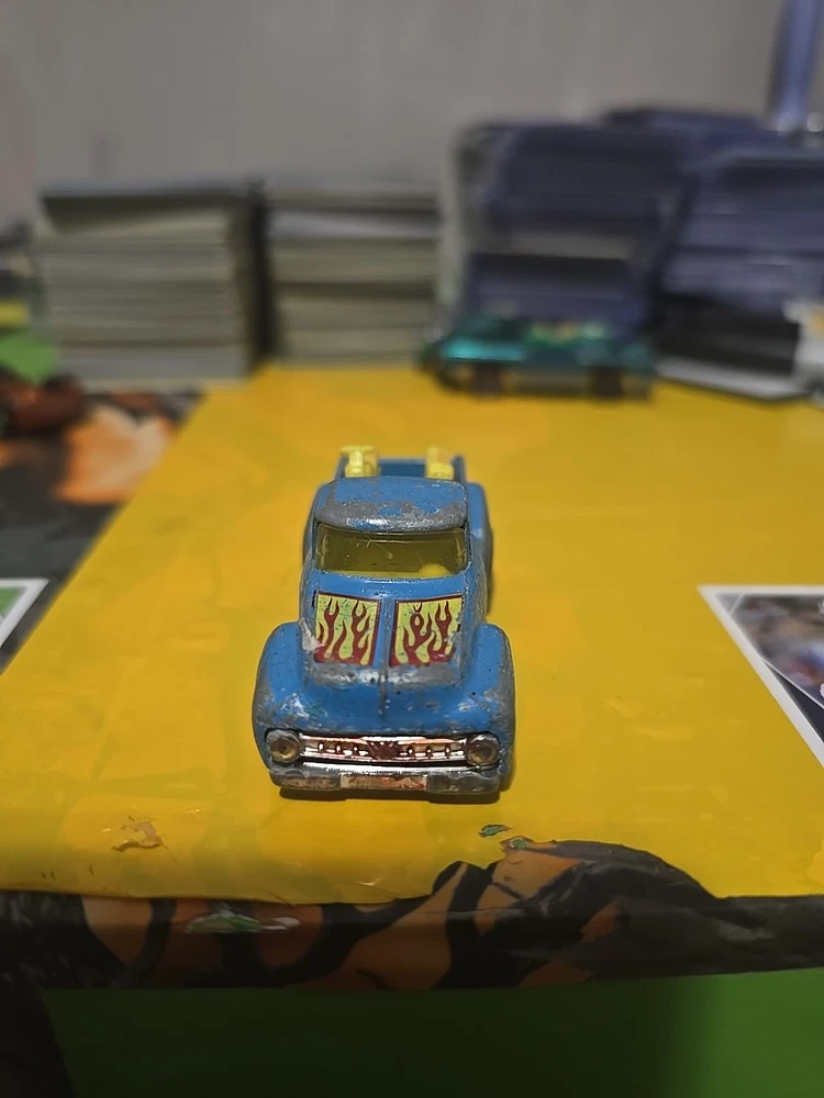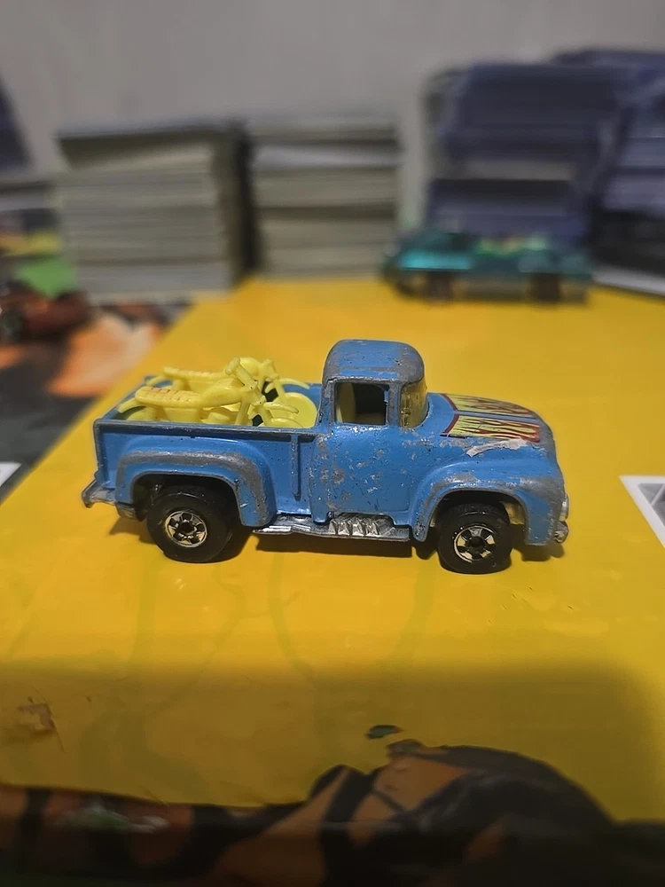 (Paint is a little rough )The Hot Wheels '56 Hi Tail Hauler Truck is a vintage diecast toy made of metal, manufactured in 1973 in Hong Kong. It features a blue Ford truck model from 1956, with yellow motorcycles as part of the design. This collectible Hot Wheels piece is part of the Blackwall BW series from the 1970s, showcasing the intricate details and craftsmanship that made Hot Wheels a popular choice among toy collectors and enthusiasts.