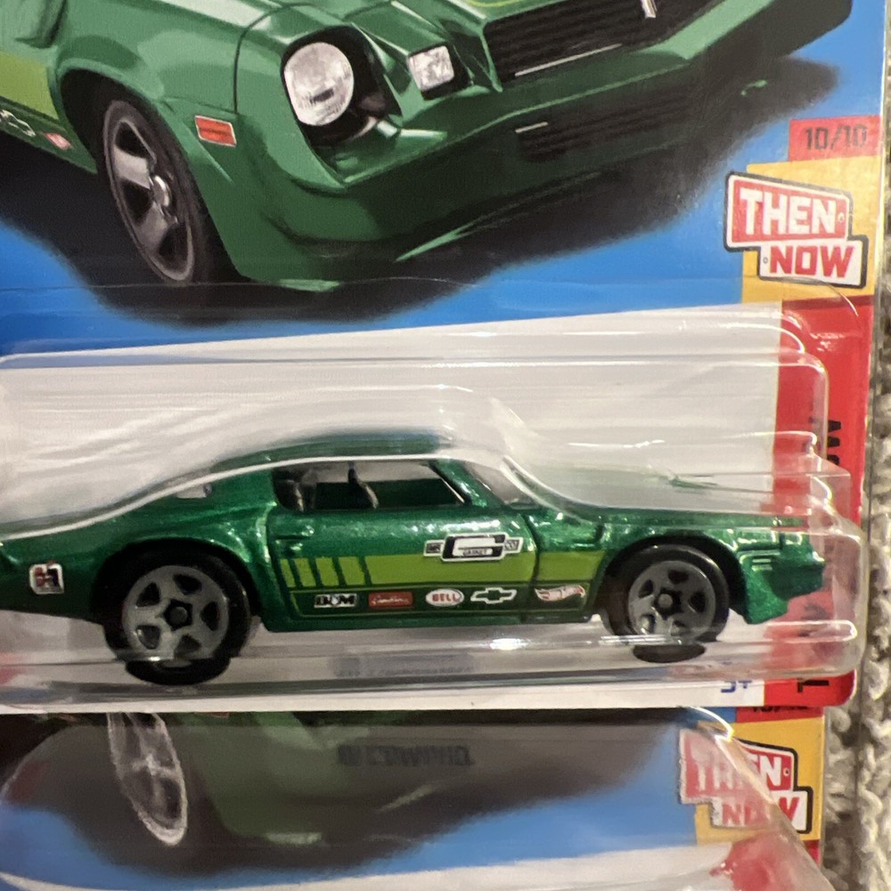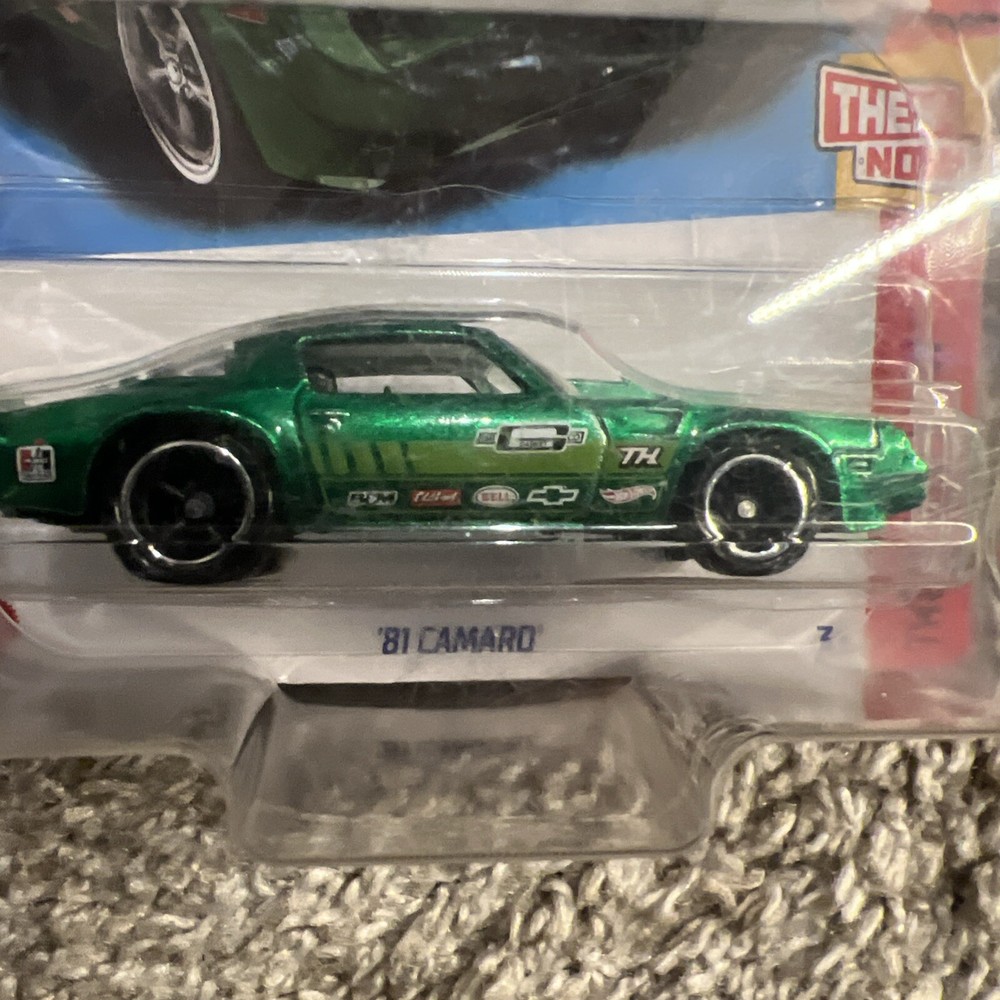 The Hot Wheels 248/250 '81 Camaro is part of the Then & Now series, featuring a Super Treasure Hunt version. This diecast Chevrolet Camaro in 1:64 scale is a 1981 model released in 2021. The green car comes with a protective case and an unopened box, making it a highly sought-after chase collectible for Hot Wheels enthusiasts