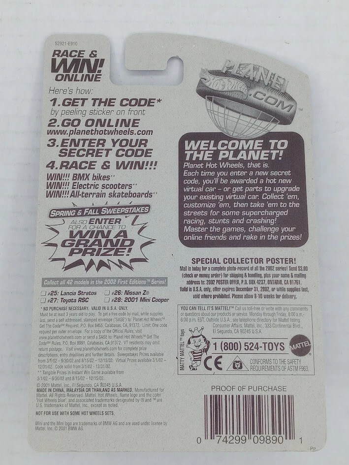 Hot Wheels 2001 Mini Cooper #040 28/42 Collectible Car Mattel Wheels NEW! SKU#101292 Look closely at the pictures to see further details. We ships USPS PLEASE see photos for detailed condition!! AC PLEASE LOOK AT THE PHOTOS CAREFULLY BEFORE PURCHASING!! If you are purchasing more than one item from us and would like combined shipping, PLEASE request an adjusted invoice from us while still in the cart and BEFORE paying. eBay does not usually calculate combined shipping accurately and you might get overcharged. Please be aware that when we photograph items, we use lighting that will show the details well. Although we try to present the product as accurately as possible, the lighting may affect the overall look of the item by appearing lighter/darker or possibly a different hue than the actual item. Depending on the type of lighting you have in your home, there may be some differences between the photos and the actual item. If this is a concern of yours, please feel free to request additional photos made in natural lighting or ask for a more detailed description of the item PRIOR TO PURCHASE! PLEASE NOTE: We greatly appreciate your interest in our item for sale. We look forward to a pleasant, quick and satisfying transaction for everybody, so please note the following information before bidding. Thank you! ITEM DESCRIPTIONS: * We will try to describe items well and provide plenty of photos. Please review these carefully before bidding or purchasing. * Only the items pictured and described are what you will receive when purchased. * We will occasionally offer an item clearly marked "AS-IS". This means that we are not sure if it works because we are unable to test it for whatever reason. We will offer these at a discounted price then a similar "working" item. It is possible that these items will work fine, but it also is possible that these items are more useful for their parts. Please only bid on or purchase these items if you are well aware of this, as we will only provide refunds of actual item price (no shipping cost refunds) for these items. * If you have any questions that aren't addressed by the descriptions or photos, please feel free to ask before you bid. * May need detailed cleaning SHIPPING: * We usually do not offer shipping to international addresses, but ARE WILLING TO TAKE CONSIDERATIONS. * We try to pack items as carefully as possible, but damage may occur during shipping. If you receive an item that was damaged in shipping, please contact us and we will work with you to resolve the problem. * We will combine shipping costs for all items the same buyer purchases from us within 2 days. Please wait to pay for items until you're done shopping with us. Please contact us if you're expecting to buy more items from us, or to have us adjust the shipping costs. * We will usually ship items out within 24 hours of payment being received Sunday through Friday at noon. We will notify the buyer if there will be a delay in shipping for some reason. Please allow additional time for holidays and weekends when the post office is closed. If payment is received after noon (EST) on Friday, the item might not be shipped until the following Monday. * We do try to recycle shipping materials as much as possible. RETURNS: We abide by eBay's Money Back Guarantee. We definitely want our customers to be happy with their purchase! You may return an item within 30 days of receiving it with the following guidelines: * If the item is defective or damaged (unless we clearly marked the listing "AS-IS"), the buyer will receive a full refund after the buyer returns it and it is received by us. Customers who falsely claim their item is defective, damaged, or not as described in order to receive a full refund and free return shipping will be permanently blocked from making future purchases from us. * If the item is as described (including "AS-IS" items) and the buyer decides for any other reason than defective/damaged to return it, only the actual price of the item will be refunded once it has been returned and it is received by us. The buyer will be asked to pay all original and return shipping charges. This includes all reasons other than defective/damaged, including wrong size, wrong type, changed mind, etc. All "AS-IS" items will fall into this category of return. Please make sure the item is what you want before purchasing it. * Please contact us before initiating a refund request. FEEDBACK: We always leave feedback at the end of transaction. We consider the transaction to be over when we receive feedback from the buyer confirming the item arrived satisfactorily. If you are unsatisfied with your purchase please contact us before leaving neutral or negative feedback. WE APPRECIATE POSITIVE FEEDBACK IF YOU ARE SATISFIED WITH YOUR PURCHASE! THANK YOU FOR YOUR INTEREST IN THIS ITEM!