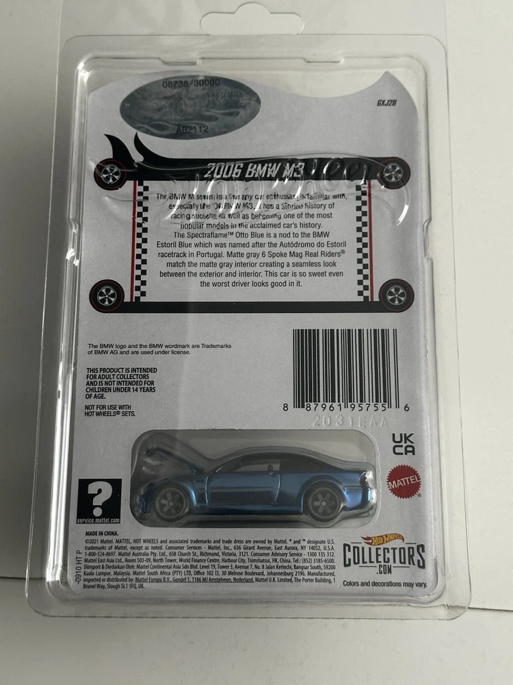 Hot Wheels RLC Exclusive Blue 2006 BMW M3 with protector included. Also the number is semi low as well (#8,738 / 30,000). The car and packaging is in great condition. Car will be carefully packaged in a box to make sure that no damage is done to the car :) Free shipping with USPS Ground Advantage βββββββββββββββββββββββββββββ This limited edition Hot Wheels RLC Exclusive Blue 2006 BMW M3 diecast car is a must-have for any collector. With its stunning blue color and 1:64 scale, it is a perfect addition to any BMW or car series collection. The car comes with a protector and is a special edition with personal number plate and real riders features. The Hot Wheels BMW E46 model is brand new and unopened in its box, making it a great gift for boys and girls of all ages. This diecast car is made of high-quality material and is a great representation of the 2006 BMW M3. Add this rare and collectible item to your collection today!