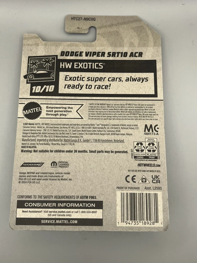 This Hot Wheels car is a 1:64 scale diecast model of a 1992 Dodge Viper SRT10 ACR in silver color. It belongs to the Hot Wheels Exotics series and comes in a P Case. The car is part of the Mainline collection and has a model number of #241. This item is perfect for collectors or enthusiasts of Hot Wheels or Dodge cars.