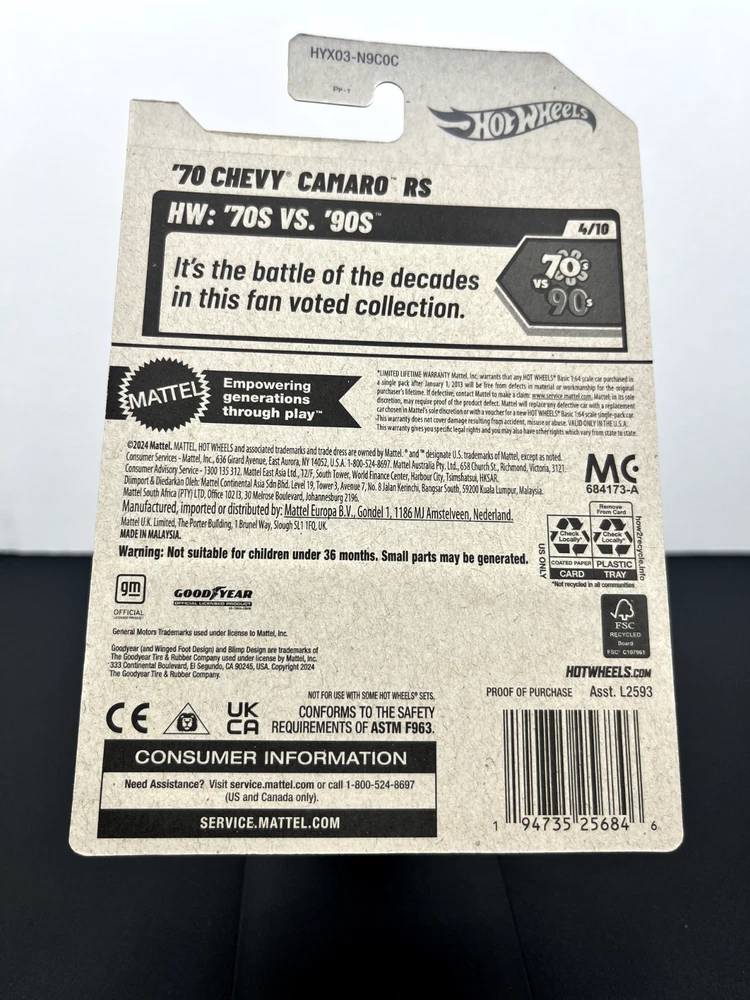 Hot Wheels 2025 Mainline C Case HW: '70s VS. '90s '70 Chevy Camaro RS is a must-have for any diecast and toy vehicle collector. The car is part of the Hot Wheels '70s VS. '90s series and is a 1:64 scale model. Perfect for collectors or anyone who loves cars and wants to have a unique and rare addition to their collection. The car has been stored in a smoke-free and pet-free environment, and it is in excellent condition. The car comes with the original packaging, making it easy to display and keep safe. Overall, this Hot Wheels 2025 Mainline C Case HW: '70s VS. '90s '70 Chevy Camaro RS is a great investment and a perfect addition to any collection. All items are shipped and sold from the USA. Will ship in a corrugated box with bubble wrap ***NO BUBBLE MAILERS***