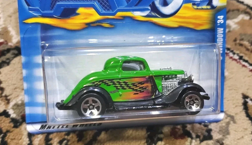Year of Manufacture:2000Scale:1:64Gender:Boys & GirlsBrand:Hot WheelsModel:Ford 3-Window CoupeSeries:Hot Wheels Race Daygtin13:074299098901Country/Region of Manufacture:MalaysiaVehicle Make:FordColor:Metallic GreenUPC:074299098901Material:DiecastVehicle Year:1934Features:Unopened Blister, White Interior, SP3 Wheels, Orange And Yellow TamposVehicle Type:Classic Ford Hot RodCharacter Family:Cars