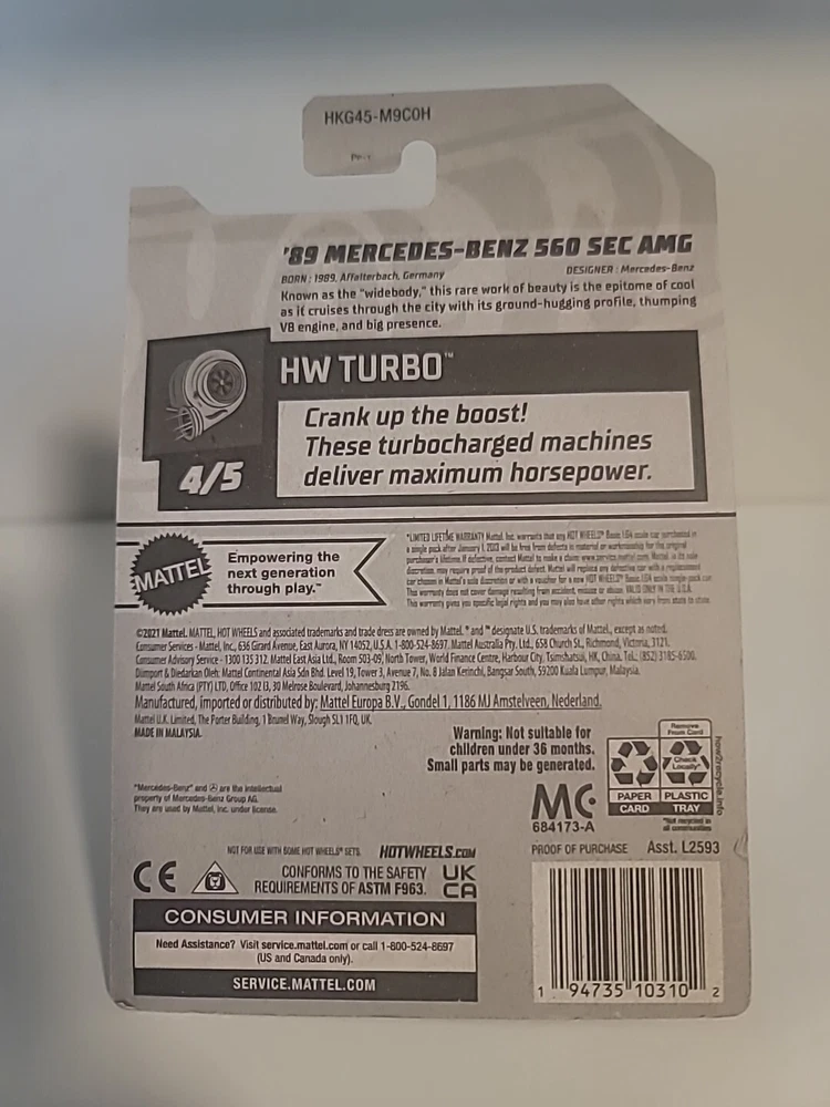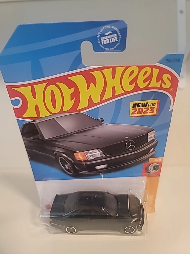 Pimp your collection with this sleek Hot Wheels '89 Mercedes-Benz 560 SEC AMG. Perfect for collectors and kids alike, this 1:64 scale diecast model is a true replica of the iconic vehicle, complete with intricate details like front and rear fampo's and a glossy black finish. Whether you're adding it to your collection or playing with it on the track, this Hot Wheels car is sure to impress. *MOC* price is for each unit, 2 units to sell