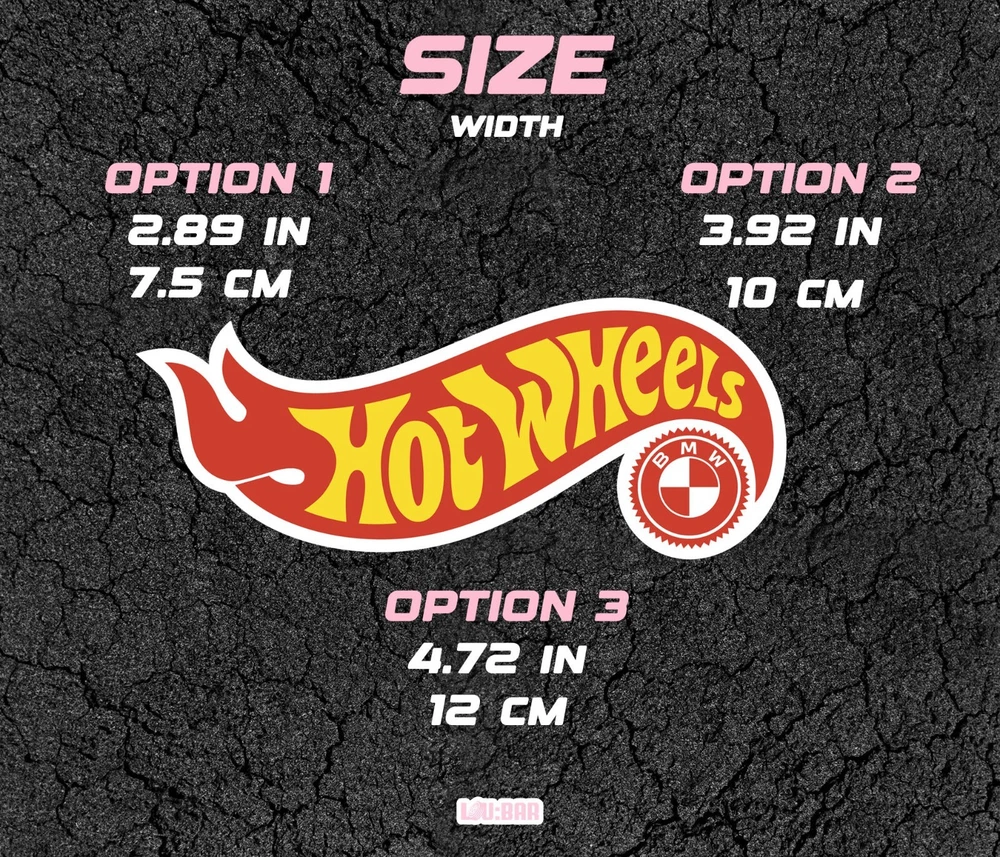 Hot Wheels BMW Logo Sticker Available in various sizes and colors. All our stickers and decals are high quality and will last long in time as they are weather resistant. Our stickers can be used as decals as well, without any issue. 100% handmade in Switzerland: from the design, the printing, the cutting to the shipping. ----------------------------------------------------- SIZE ----------------------------------------------------- Option 1 7.5 cms Option 2 10.0 cms Option 3 12 cms ----------------------------------------------------- M A T E R I A L S ----------------------------------------------------- Application: Outside. Weather Resistant: Yes. ----------------------------------------------------- SHIPPING INFORMATION ----------------------------------------------------- Shipping within 48-72 hours. To maintain low shipping costs, there are no tracking options available. ----------------------------------------------------- N O T E S ----------------------------------------------------- The colors may vary depending on your screen settings. If you have any hesitations or questions, don?t hesitate to message us.