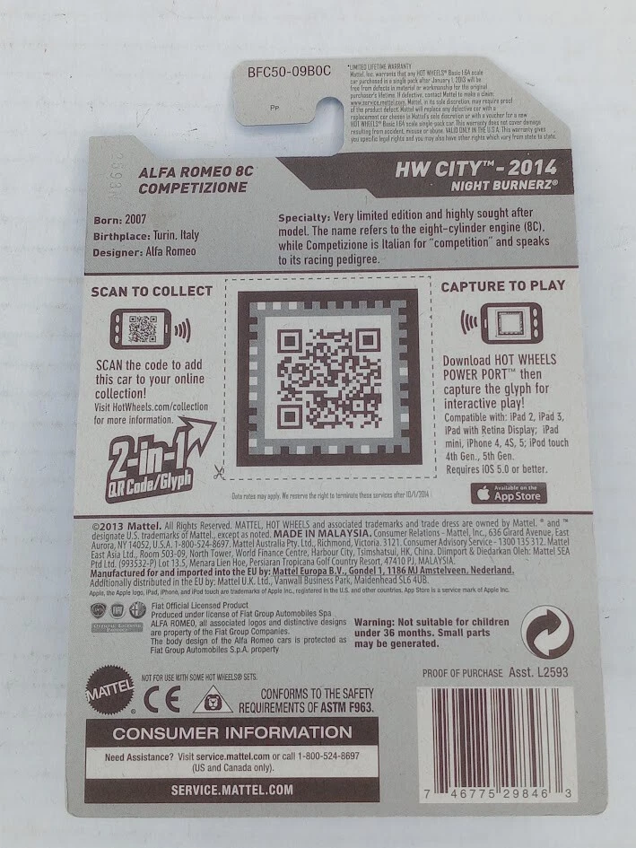Hot Wheels Black Alfa Romeo 8C Competizione #29 2014 SKU#101310 Look closely at the pictures to see further details. We ships USPS PLEASE see photos for detailed condition!! AC PLEASE LOOK AT THE PHOTOS CAREFULLY BEFORE PURCHASING!! If you are purchasing more than one item from us and would like combined shipping, PLEASE request an adjusted invoice from us while still in the cart and BEFORE paying. eBay does not usually calculate combined shipping accurately and you might get overcharged. Please be aware that when we photograph items, we use lighting that will show the details well. Although we try to present the product as accurately as possible, the lighting may affect the overall look of the item by appearing lighter/darker or possibly a different hue than the actual item. Depending on the type of lighting you have in your home, there may be some differences between the photos and the actual item. If this is a concern of yours, please feel free to request additional photos made in natural lighting or ask for a more detailed description of the item PRIOR TO PURCHASE! PLEASE NOTE: We greatly appreciate your interest in our item for sale. We look forward to a pleasant, quick and satisfying transaction for everybody, so please note the following information before bidding. Thank you! ITEM DESCRIPTIONS: * We will try to describe items well and provide plenty of photos. Please review these carefully before bidding or purchasing. * Only the items pictured and described are what you will receive when purchased. * We will occasionally offer an item clearly marked "AS-IS". This means that we are not sure if it works because we are unable to test it for whatever reason. We will offer these at a discounted price then a similar "working" item. It is possible that these items will work fine, but it also is possible that these items are more useful for their parts. Please only bid on or purchase these items if you are well aware of this, as we will only provide refunds of actual item price (no shipping cost refunds) for these items. * If you have any questions that aren't addressed by the descriptions or photos, please feel free to ask before you bid. * There may be bends, dents or parts of the blister that have minor issues due to long term storage. Such things will be pointed out under the description, please look closely at the pictures for further details. SHIPPING: * We usually do not offer shipping to international addresses, but ARE WILLING TO TAKE CONSIDERATIONS. * We try to pack items as carefully as possible, but damage may occur during shipping. If you receive an item that was damaged in shipping, please contact us and we will work with you to resolve the problem. * We will combine shipping costs for all items the same buyer purchases from us within 2 days. Please wait to pay for items until you're done shopping with us. Please contact us if you're expecting to buy more items from us, or to have us adjust the shipping costs. * We will usually ship items out within 24 hours of payment being received Sunday through Friday at noon. We will notify the buyer if there will be a delay in shipping for some reason. Please allow additional time for holidays and weekends when the post office is closed. If payment is received after noon (EST) on Friday, the item might not be shipped until the following Monday. * We do try to recycle shipping materials as much as possible. RETURNS: We abide by eBay's Money Back Guarantee. We definitely want our customers to be happy with their purchase! You may return an item within 30 days of receiving it with the following guidelines: * If the item is defective or damaged (unless we clearly marked the listing "AS-IS"), the buyer will receive a full refund after the buyer returns it and it is received by us. Customers who falsely claim their item is defective, damaged, or not as described in order to receive a full refund and free return shipping will be permanently blocked from making future purchases from us. * If the item is as described (including "AS-IS" items) and the buyer decides for any other reason than defective/damaged to return it, only the actual price of the item will be refunded once it has been returned and it is received by us. The buyer will be asked to pay all original and return shipping charges. This includes all reasons other than defective/damaged, including wrong size, wrong type, changed mind, etc. All "AS-IS" items will fall into this category of return. Please make sure the item is what you want before purchasing it. * Please contact us before initiating a refund request. FEEDBACK: We always leave feedback at the end of transaction. We consider the transaction to be over when we receive feedback from the buyer confirming the item arrived satisfactorily. If you are unsatisfied with your purchase please contact us before leaving neutral or negative feedback. WE APPRECIATE POSITIVE FEEDBACK IF YOU ARE SATISFIED WITH YOUR PURCHASE! THANK YOU FOR YOUR INTEREST IN THIS ITEM! !