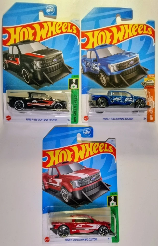 This lot includes three Hot Wheels Ford F-150 Lightning Custom trucks in black, red, and blue colors. These 1:64 scale diecast trucks are from the HW Green Speed series and are unopened in their original boxes. The trucks feature the Ford F-150 Lightning Custom model and were manufactured in 2024. The Hot Wheels brand is known for its high-quality diecast vehicles, and this lot is no exception. These trucks are perfect for collectors or children who love toy vehicles. Don't miss out on the chance to add these sleek and stylish trucks to your collection.